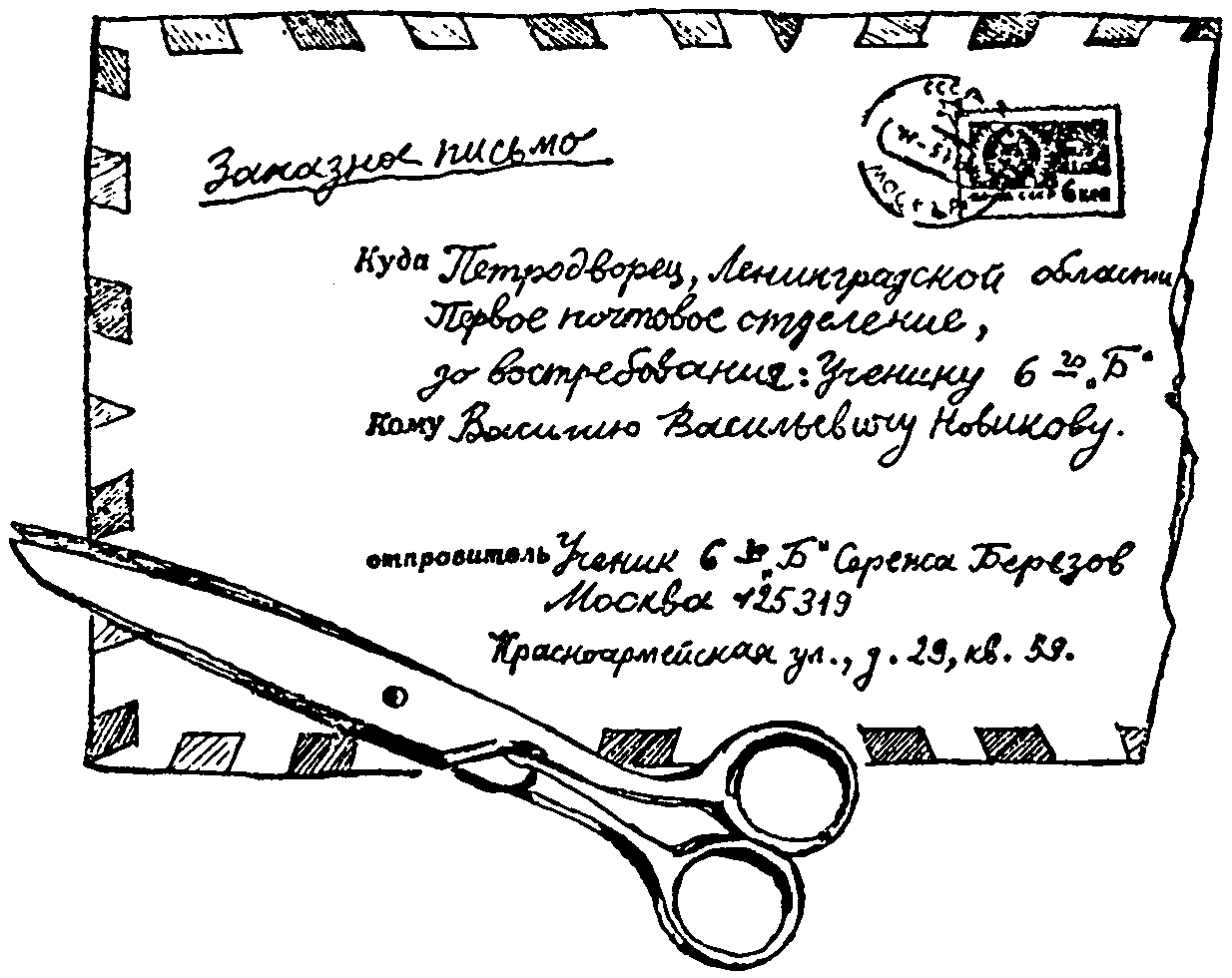 Дорогой Вася! Не люблю я писать письма, но тут не могу удержаться… Случилось такое, что мне самому кажется как будто это приснилось… Но я гляжу на три клеёнчатые тетради… некоторые страницы размыты морской водой… Какой же это сон, если загадочные тетради лежат на столике у кровати… Ты помнишь, Вася, первый урок нового учителя географии Афанасия Петровича?.. Он не очень показался всему классу, да и географическому кружку «Алый вымпел»… Но вскоре, после твоего отъезда в Петродворец, к тётке, на каникулах всё завертелось… Ребята разъехались кто в пионерский лагерь, кто на дачу… Нас осталось в Москве восемь человек «городских воробьёв»… в том числе девочки Маруся и Наташа. И вот прибегает ко мне Наташа и зовёт на срочное заседание «Алого вымпела»… И, представь себе, через сорок восемь часов ноль минут мы с рюкзаками за спиной берём старт к ледниковым озёрам Подмосковья на автобусе до остановки Габо на Рогачёвском шоссе, а дальше пешком по лесам к реке Мещерихе. Мы побывали на озёрах Долгое, Круглое, Глубокое, но небывалая находка ожидала нас на берегу Озера Чаек… Их там тысячи и тысячи… Оказывается, они весной, после зимовки в дельте Нила прилетают в Подмосковье прямо из Египта… Это нам Афанасий Петрович рассказал!.. Вот здорово!.. Ко не это самое удивительное… Перед вечерним костром мы разбрелись но лесу в надежде найти какие-нибудь следы ледникового периода… Я лично мечтал найти клык мамонта или хотя бы зубы доисторического ящера… Ничего не нашёл и с пустыми руками бреду к привалу… Вдруг замечаю на коре старой ели вырезанный ножом знак — летящая стрела… Беру направление по стреле… выхожу на поляну и вижу дуб-великан, разбитый молнией… Ты не поверишь, Вася!.. В огромном дупле я нашёл старинный сундучок, обитый позеленевшими медными полосами. Я его с трудом донёс до наших палаток… Что было у вечернего костра, я далее не могу описать… Афанасий Петрович осторожно вскрыл сундук… А в нём оказался целый клад… кортик с позолоченным эфесом, морская треуголка с плюмажем, корабельный компас в кожаном футляре, навигационная карта восемнадцатого века, малиновая феска с чёрной кисточкой, подзорная труба и зонтик из козьих шкур… А на самом дне лежал кусок старой парусины, в которую были завёрнуты три клеёнчатые тетради… Это были вахтенные журналы Клуба знаменитых капитанов!.. Кому принадлежал таинственный сундук? Почему он оказался вблизи от Озера Чаек?.. Кто его там спрятал? Кто вёл вахтенные журналы Клуба знаменитых капитанов?.. Никто ответить на эти вопросы не мог, Я понимаю, что ты мне не веришь, и для ясности высылаю тебе ценной бандеролью первую клеёнчатую тетрадь под названием «Операция «Пилигрим». Как только прочитаешь, сразу же отправляй обратно. Все тетради хранятся у меня, как у старосты кружка «Алый вымпел», и Афанасий Петрович всегда может их спросить… А чтобы ты не подумал, что я сам всё это сочинил… прилагаю фотографию места находки… Видишь дуб, разбитый молнией, а перед ним все наши ребята… В морской треуголке с плюмажем — это я. В подзорную трубу смотрит Тарас, Наташа напялила турецкую феску, Ваня вооружился кортиком… А на загадочном сундучке сидит Афанасий Петрович с корабельным компасом на коленях. Ну, что, Вася, теперь веришь?! Остаюсь твой друг и сосед по школьной парте Серёжа Берегов |