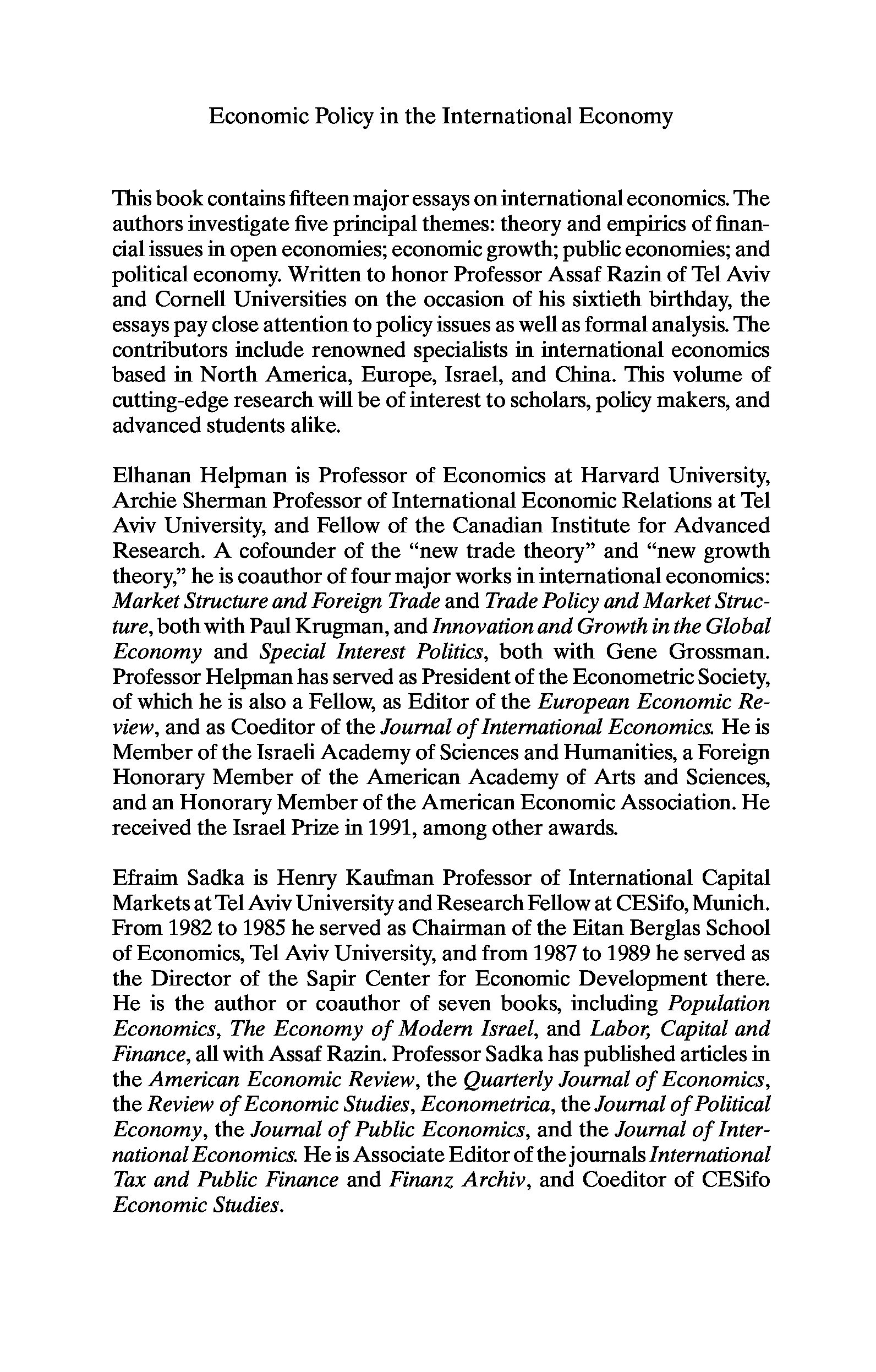 "Economic Policy in the International Economy: Essays in Honor of Assaf Razin" - читать интересную книгу автора (Elhanan Helpman, Efraim Sadka)