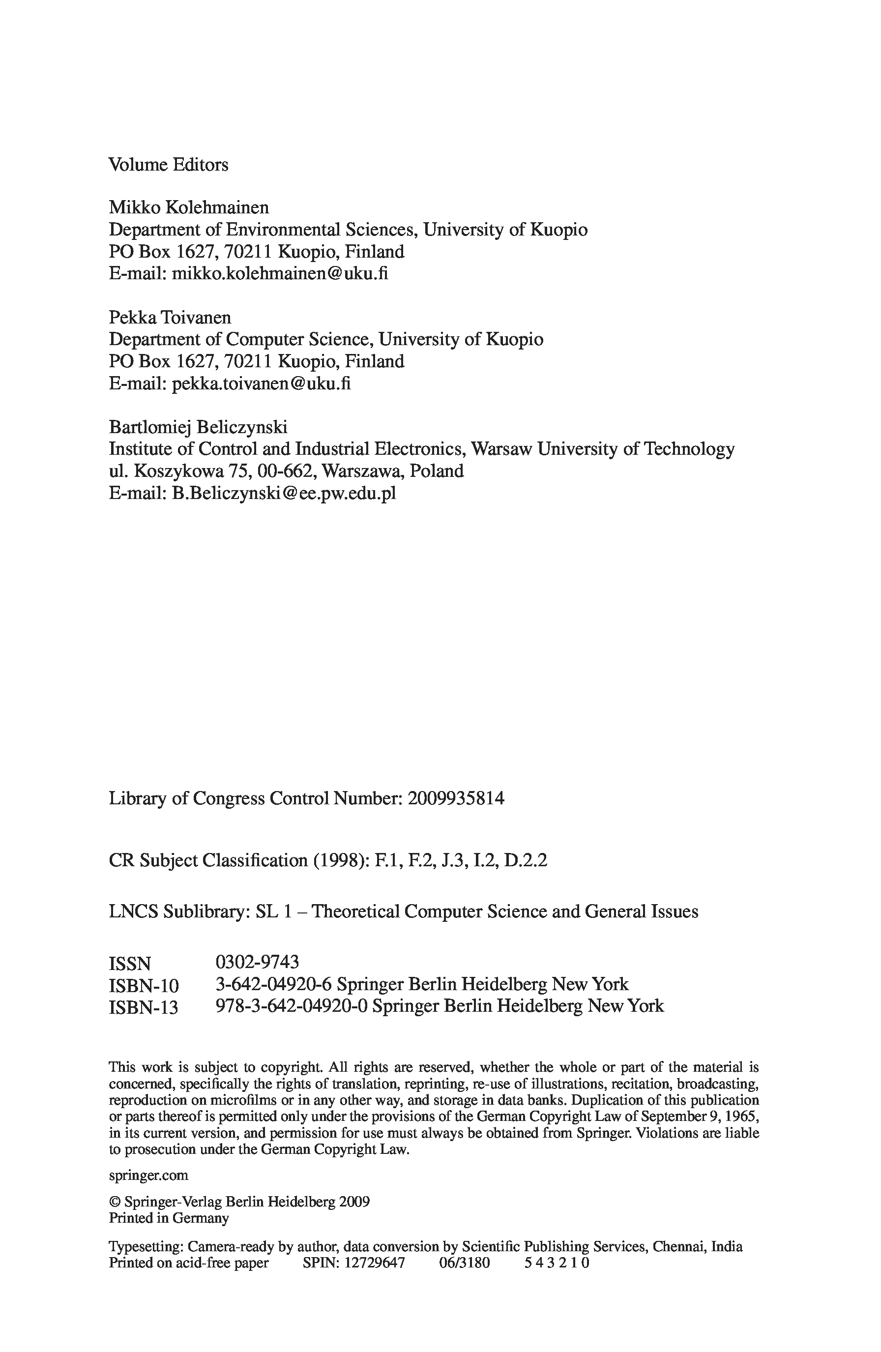"Adaptive and Natural Computing Algorithms: 9th International Conference, ICANNGA 2009, Kuopio, Finland, April 23-25, 2009, Revised Selected Papers ... Computer Science and General Issues)" - читать интересную книгу автора (Ville Kolehmainen, Pekka Toivanen, Bartlomiej Beliczynski)