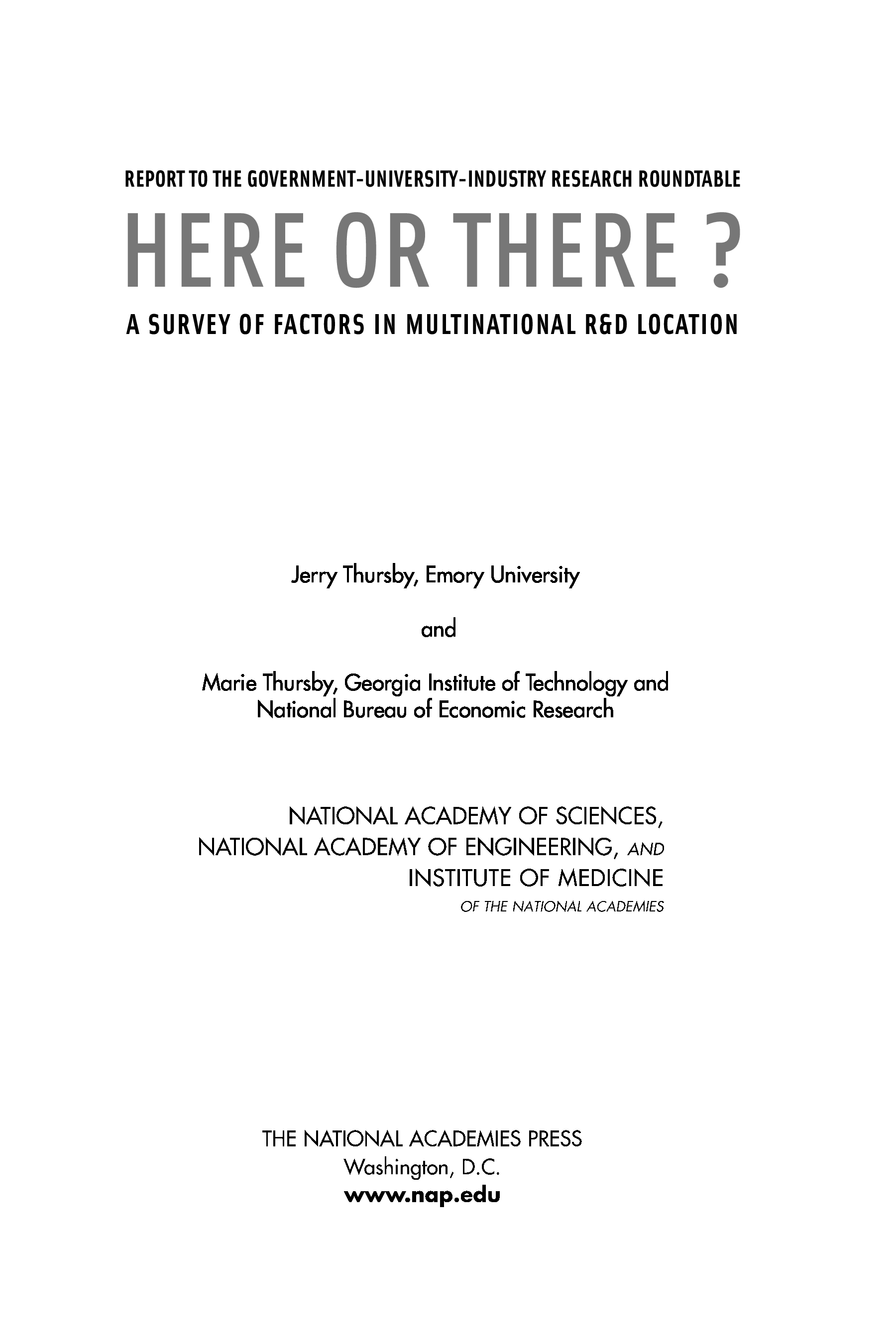 "Here or There?: A Survey of Factors in Multinational R&D Location -- Report to the Government-University-Industry Research Roundtable" - читать интересную книгу автора (Jerry Thursby, Emory University and Marie Thursby, Georgia Institute of...)
