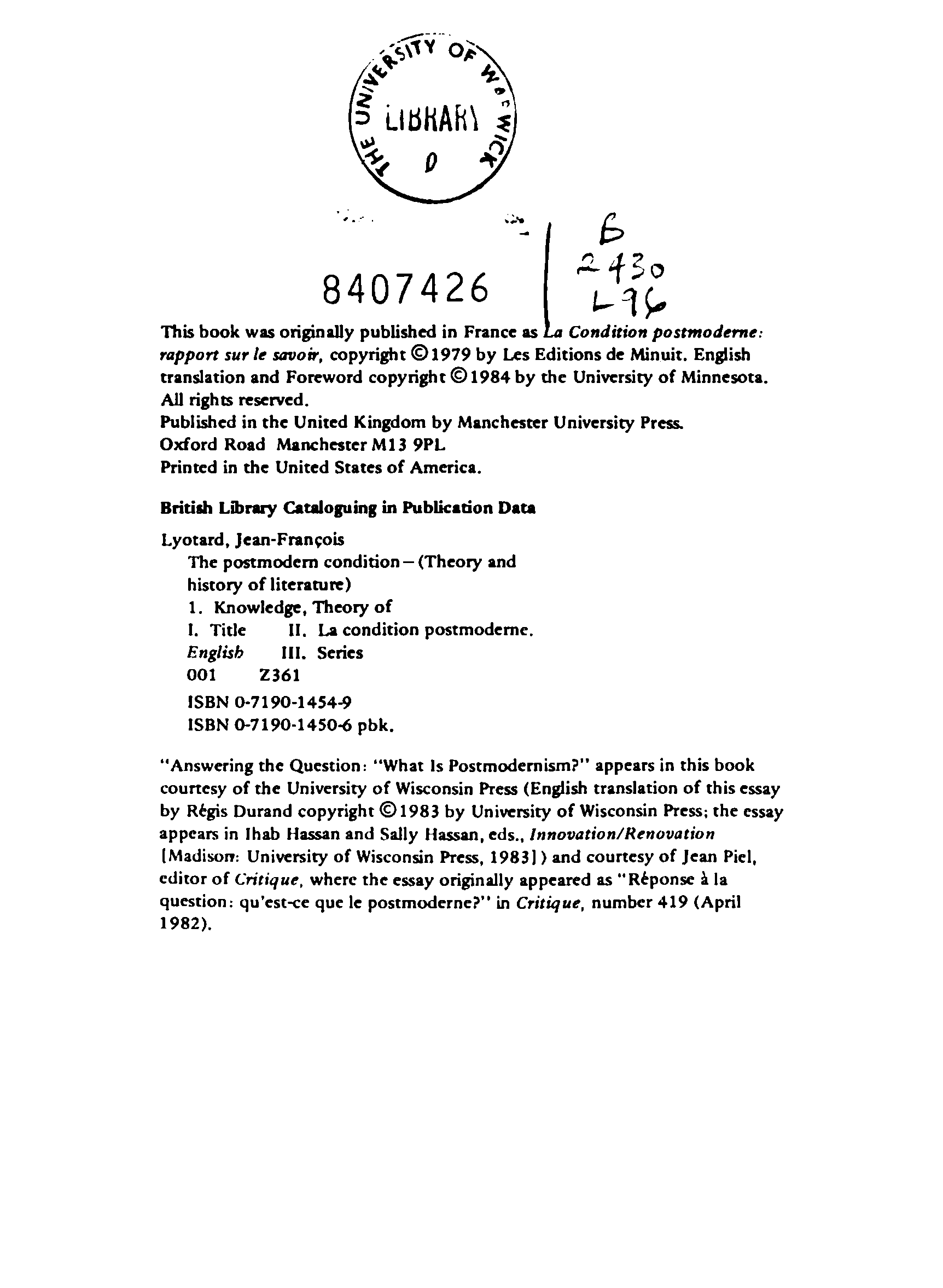(Jean-Francois Lyotard, G. Bennington (Translator), B. Massumi (Translator))