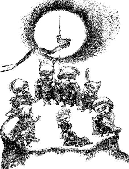 – Как вам известно, – начал он, – дом Расяле и Гедрюса постигла беда. Сгорело много всякого добра, а главное – пострадал наш добрый друг, о котором я еще скажу позже. Отвечай, Живилёк, тебе известно, отчего вспыхнул пожар? Живилёк стоял, потупясь, и шелушил какое-то семечко. – Мы тебя спрашиваем, как возник пожар? – повторил Дилидон. – Дом загорелся, вот и возник… – негромко ответил гном, пытаясь раскусить зернышко. – А кто подговорил Расяле разжечь костер в комоде? Кто показал, где спички спрятаны? – Показал-то я, но я думал, что картошку она в плите будет печь… – Вот что, Живилёк, – серьезно сказал Дилидон, – ты уже не маленький, пора и за дело приниматься. Возьмешь стремянку, кисть и пойдешь раскрашивать грибам шляпки. – Ой-ой-оюшки, только бы он не выкрасил мухоморы под боровики! – заволновался парикмахер. – Дайнис научит, чем что красить! – Мне бы больше хотелось яйца расписывать, – робко попросил Живилёк. – Будешь, будешь, – пообещал Дайнис, – когда с грибами управишься. По правде говоря, Живилёк ждал наказания пострашнее. Красить грибы – все-таки ремесло. «Учение – свет», – как говорит Мудрик, который вечно сидит, зарывшись в книги. Хоть Живилёк сам и не устраивал пожара, но вообще-то он любил смотреть на огонь и не раз нашептывал Расяле, что огонь – живой, иногда веселый, иногда угрюмый. Вот, скажем, когда дрова сырые, огонь даже пищит, плачет – он так хочет все согреть, быть добрым ко всем… И вот к чему привели легкомысленные сказочки Живилька. Как же теперь вознаградить Гедрюса, который чуть было не ослеп на пожаре? – Мало и без того забот, так еще одна прибавилась… – говорил Дилидон. – Гедрюс и Микас – лучшие друзья – ссорятся между собой, дерутся, а до нас им и дела нет. Вокруг птицы щебечут, прямо из-под ног вылетают пестрые бабочки – а им хоть бы что!.. В гномов больше не верят, вот в чем беда! – Надо, чтоб они нас увидели! – воскликнули одновременно Дайнис, Мураш и Бульбук. – Ну, пусть не оба сразу, так хоть пока один Гедрюс, такой молодчина! – У нас его очки, еж принес, – продолжал Дилидон. – А Мудрик говорит, что когда-то гномы умели изготовлять такую микстуру «гляди насквозь» – может, попробовать?.. – У меня есть рецепт! – откликнулся Мудрик, поднимая книгу, заложенную травинкой. Гномы тут лее окружили его, как пчелы матку. Ученый раскрыл книгу, откашлялся и начал читать: – – Ну как? Возьмемся или нет? – спросил Дилидон. – Возьмемся! – откликнулись гномы. – Попытаем счастья… – Во что бы то ни стало сделаем! Пусть Гедрюс увидит и узнает больше, чем другие без очков. Он это заслужил. Один только Живилёк чесал макушку и молчал. С Расяле-то играть было куда легче… Что ж, вздыхать некогда. Надо готовиться к походу на озера… Чтобы приободрить своего будущего подмастерье, Дайнис весело затянул третий куплет марша: |
