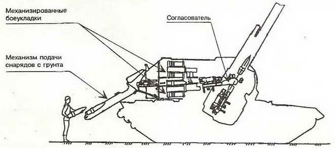 Гаубица 2А64 имеет раздельно-гильзовое заряжание. Подача снарядов автоматическая, подача зарядов полуавтоматическая. Весь боекомплект расположен в башне и позволяет проводить заряжание при любых углах горизонтального и вертикального наведения. Наличие полуавтоматических систем заряжания облегчает работу экипажа и обеспечивает скорострельность до 7-8 выстрелов в минуту при использовании возимого боезапаса, и до 6-7 выстрелов – при подаче выстрелов с грунта. При стрельбе с грунта требуется дополнительно еще два человека для подачи снарядов в специальном конвейере – один для снарядов, другой для зарядов.