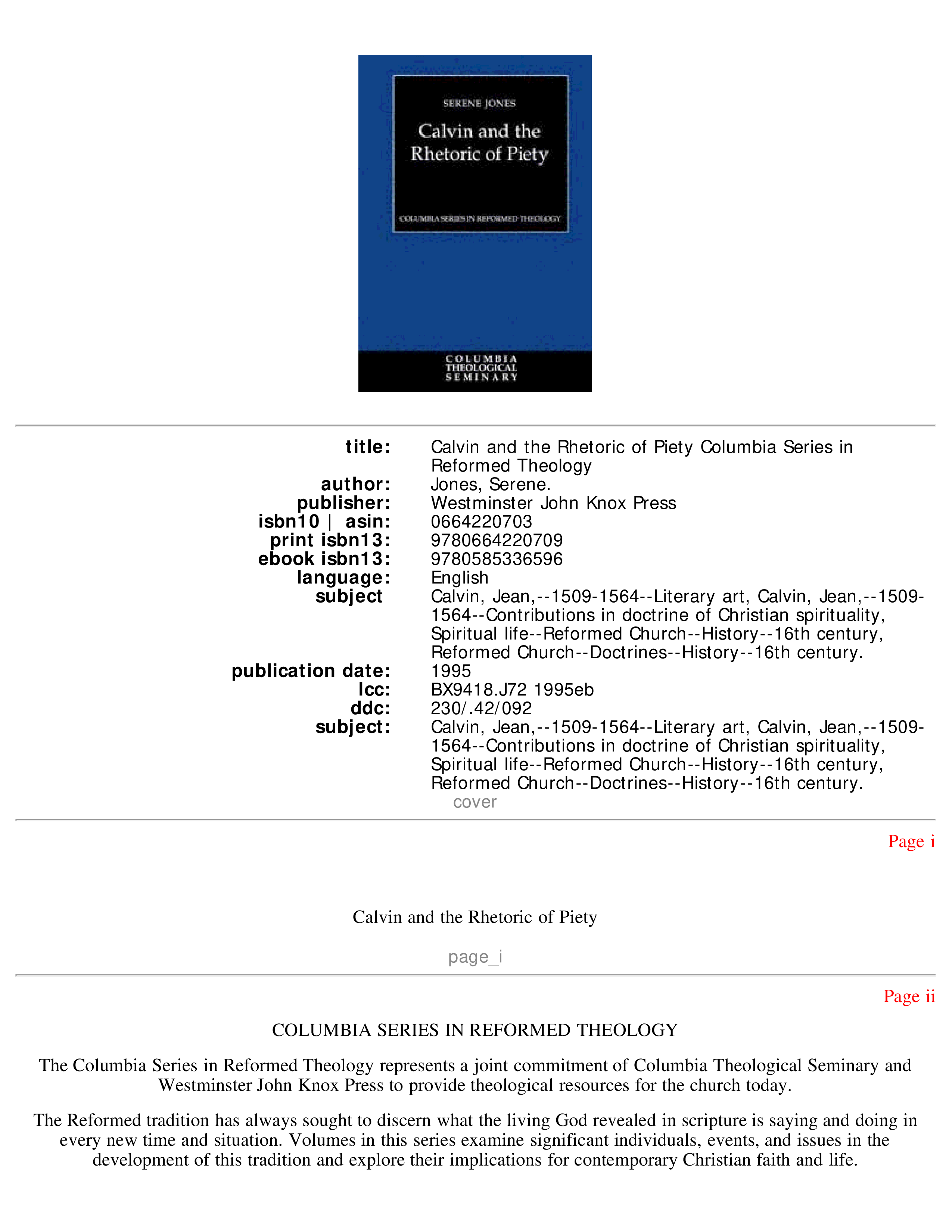 "Calvin and the Rhetoric of Piety (Columbia Series in Reformed Theology)" - читать интересную книгу автора (Serene Jones)