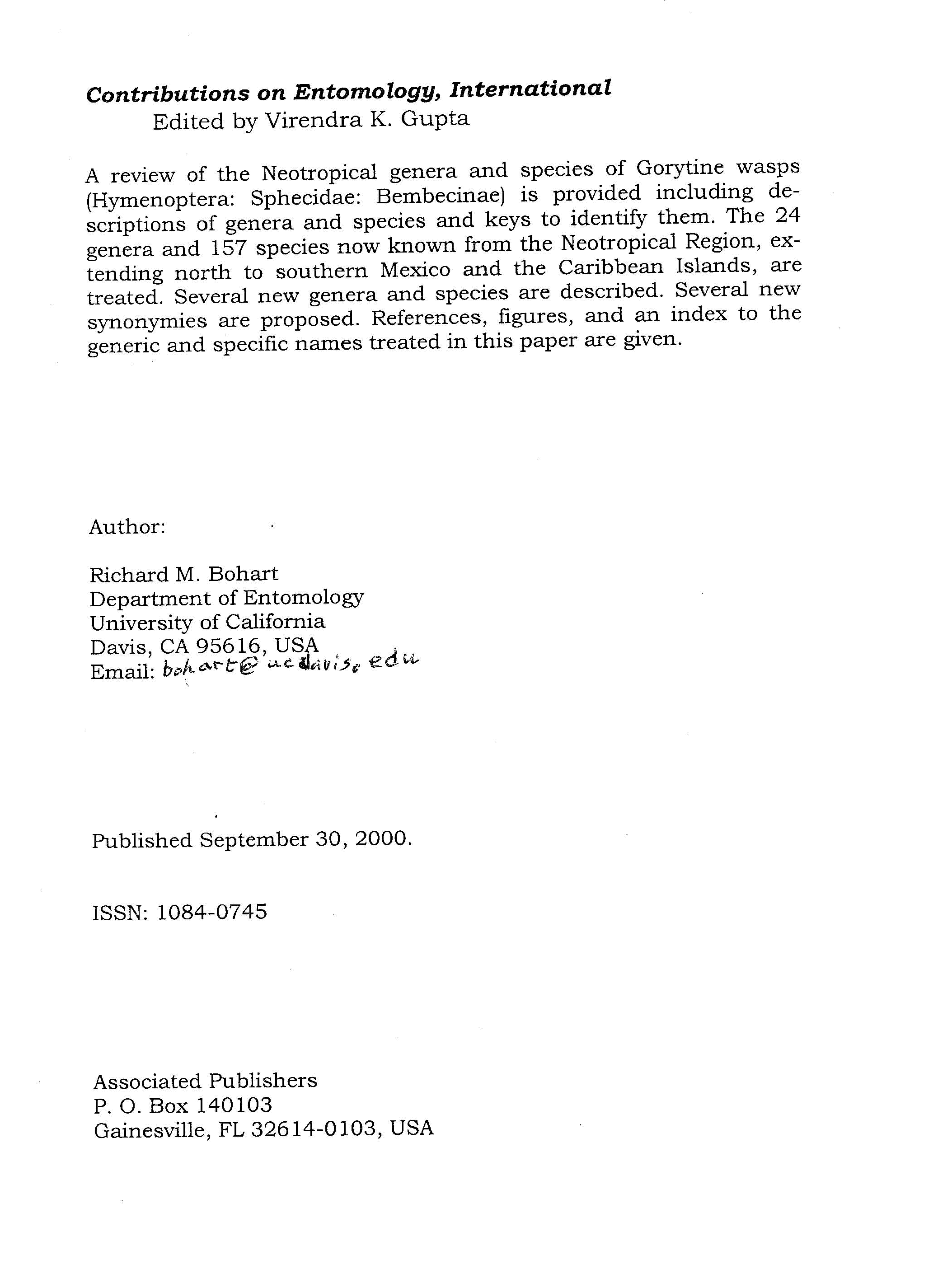 "A review of Gorytini in the Neotropical Region (Hymenoptera: Sphecidae: Bembicinae)" - читать интересную книгу автора (Richard Bohart)
