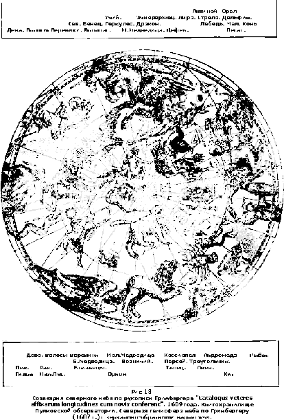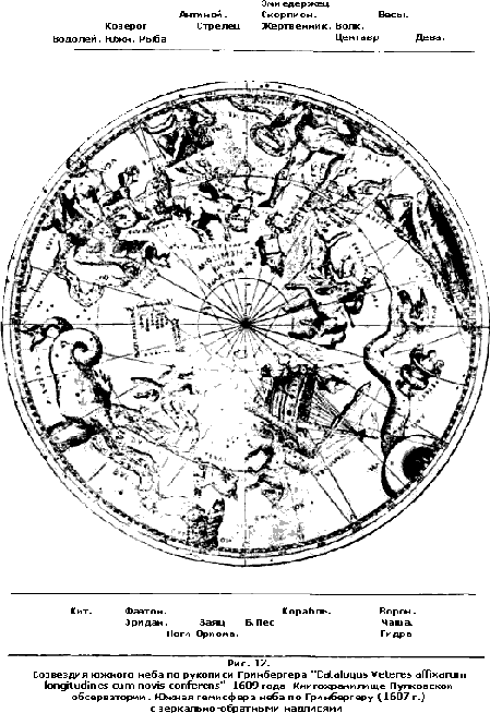 Действительно, все атрибуты древних эолов остались и здесь. Когда дует один ангел, происходит ветер с его стороны, когда дуют сразу несколько или все четыре, происходит ураган. Все осталось так же, как было в греческой литературе языческого периода! Для нас же в настоящем случае интереснее всего то, что в Апокалипсисе мы найдем не только ряд таких трубных ангелов, символов бури и грозы, но и тех четырех Индикоплевстовых эолов, которые удерживают в момент затишья перед грозой четыре подвластные им ветра, хотя автор Апокалипсиса, повидимому, уже знал, что земля шарообразна. А вот и еще более упрощенное представление о небе и земле, приписываемое, и притом более правдоподобно, тому же Косьме Индикоплевсту, имя которого значит просто: Индоплавающий Мир (рис. 11). Таковы были наивные понятия древних греков о земле и о происходящих на ней стихийных явлениях. Не более сложны были их представления и о небе. Оно казалось им, судя по религии и умственному развитию каждой данной личности, или стеклянным колпаком, прикрывающим сверху, по Библии, только-что рассмотренную нами землю Косьмы Индикоплевста, или стеклянным шаром, в центре которого поддерживалась невидимыми существами шаровидная по Птолемею, а по другим—кубическая земля. Вот здесь, на этой новой картине (рис. 12), вы видите южное полушарие звездного неба древних, снятое мною (в обратном виде) со старинной рукописи Гринбергера, хранящейся в библиотеке Пулковской обсерватории и относимой к 1609 г. На ней вы видите, кроме обычных созвездий, почти таких же, как и в наши дни, еще целый ряд странных зверей и других предметов, никогда не существовавших в глубине неба. Каким образом попали сюда эти странные изображения? Ответ дают во многих случаях сами их названия. Возьмем, например, в верхней части нашей первой карты хоть фигуру Весов в созвездии того же имени. Зачем попали сюда весы, когда очертание заключающейся в них группы звезд не имеет с этим измерительным прибором ничего общего? Очень просто. Дело в том, что солнце, всегда движущееся между звездами, как муха, ползающая, по выражению Араго, по потолку комнаты между его пылинками, подходит ежегодно к этому месту, когда на земле бывает осеннее равноденствие, т.е. день становится равен ночи. Теперь вы понимаете и смысл поставленной здесь фигуры. Первый астроном, халдей или египтянин, заметивший такое совпадение, отметил на составленной им карте это место неба фигурой весов, как символом равновесия дня и ночи. Значит, изображение это есть простая надпись и относится, очевидно, к тому отдаленному времени, когда люди в своих записях любили заменять предметы их изображениями, а идеи — их символами, как здесь идея равновесия дня и ночи Значит, фигура эта была здесь, в момент своего возникновения, простой идеографической надписью. Такими же надписями является несомненно и значительное число других изображений. Вот, например, на верхней части первой карты, но с левой стороны, вы видите изображение голого человека с урной, из которой течет вода. Головы его вы здесь не видите, так как она уходит на нашу северную гемисферу неба. Зачем здесь этот человек? Очень просто. Потому что эта фигура кульминирует в полночь, когда в Египте бывает разлив Нила. Только это и хотел отметить древний наблюдатель, нарисовавший здесь человека, льющего воду из урны. Такие же фи