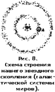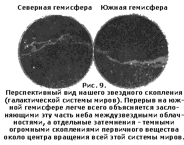 Неравномерно наполнено ими пространство вселенной. В его бесконечности то здесь, то там плавают, как архипелаги островов на море, отдельные звездные скопления, каждое из миллионов светил, сгруппировавшихся вместе как бы в звездные венки. Все видимые нашим глазом светила составляют лишь незначительную область внутри одного из таких венков (рис. 8, А, в маленьком кружке), и вне этой области мы уже не можем разобрать простым глазом ни одной отдельной звезды. Детальное изучение общего вида неба и тесноты размещения звезд в его различных областях показывает нам, что этот звездный венок находится внутри другого такого же венка (рис. 9), звезды которого сливаются в опоясывающую все видимое нами небо янтарную белесоватую полосу. Эта полоса кажется для нас более широкой за созвездием Ориона, где наружное кольцо находится к нам всего ближе, в кажется нам более узкой за созвездием Скорпиона, где кольцо наиболее удалено от нас, как это и следует по правилам перспективы. Что же касается внутреннего звездного венка, в котором мы живем, то очевидно, что он не может нам казаться охватывающим всю сферу видимого нами пространства вселенной, но только его половину, а вблизи нас этот венок должен распадаться для наших глаз на тысячи звезд. Это очень ясно вы можете видеть при рассмотрении моей схемы. Вы видите на ней, что всякий луч зрения, идущий вниз из точки А, где предполагаемся мы, не встретит уже на своем пути ни одной слившейся в полосу части внутреннего кольца. Он встретит только его отдельные звезды. Точно также и все лучи зрения, идущие хотя бы и косвенно в правую половину схемы. Совсем не то, когда мы проектируем на нашем плане лучи зрения в левом направлении. Тогда каждый из них встретит в отдалении цельную Часть внутреннего кольца, а потому понятно, что перспективно полоса этого кольца будет нам казаться протянувшейся лишь по половине неба левой гемисфере чертежа). Кроме того, этот внутренний венок имеет не равноплотное, а облачное строение, т.е. составлен из многих звездных скоплений.