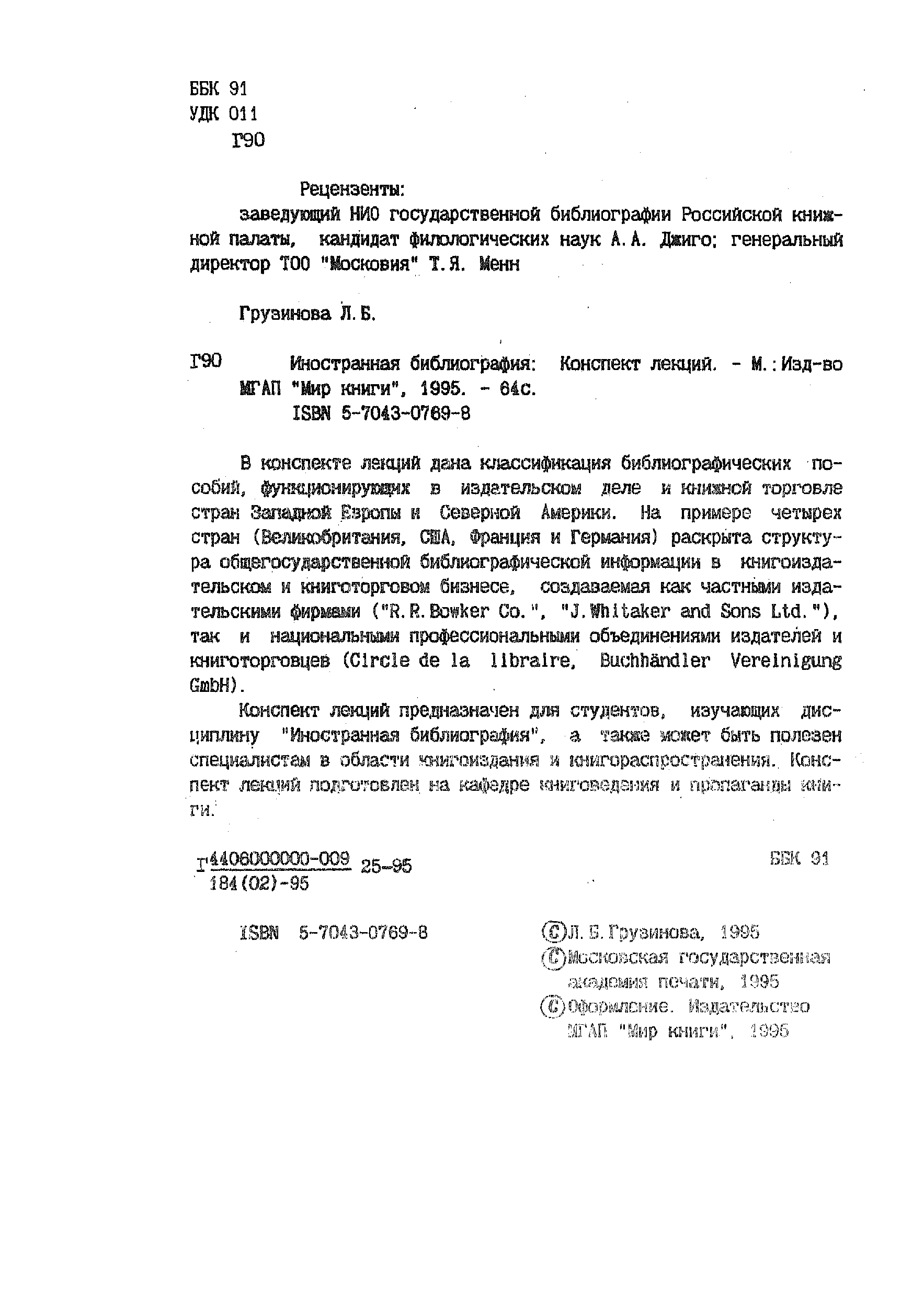 "Иностранная библиография Конспект лекций для студентов, обучающихся по направлению 520700 "Книговедение"" - читать интересную книгу автора