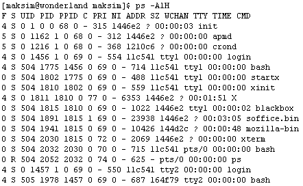 В выводе на Рис. 1-45 присутствуют четыре колонки. «PID» — это уникальный для системы В данном случае Алиса получила информацию о двух процессах: оболочке «bash» и внешней команде «ps»[37]. Команда «ps -A» выводит информацию обо всех процессах в системе[38]. В примере на Рис. 1-46 мы, подав команду из эмулятора терминала, для наглядности использовали ключ «-A» вместе с ключом «-l» («эль»), задающим «длинный» формат вывода (с дополнительными полями) и нестандартным ключом «-H», представляющим с помощью отступов в поле «CMD» отношения между процессами (вывод немного сокращен).