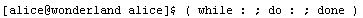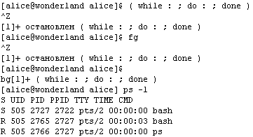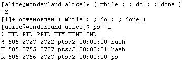 Если Алиса все сделала правильно, то сценарий сам по себе уже не остановится никогда (скорее всего, до разгрузки системы). Приглашения оболочки Алиса тоже уже не получит, поэтому даже не сможет выйти из системы. Справиться с этой ситуацией ей поможет клавиатурная комбинация Control-C. Как и комбинация Control-D, она не отображается на экране, но после ее нажатия Алиса получает приглашение оболочки и при помощи команды «ps» убеждается, что никаких процессов, кроме самой оболочки и «ps», под этой оболочкой не выполняется.