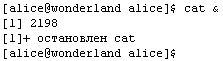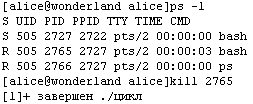 В примере на Рис. 1-50 Алиса запускает сценарий «цикл», останавливает его нажатием Control-Z, затем возобновляет его выполнение на переднем плане командой «fg», снова останавливает, и затем возобновляет на заднем плане командой «bg». После этого Алиса сразу получает приглашение и, введя команду «ps -l», видит соответствующий выполнению сценария процесс «bash» (PID 2765) с состоянием «R» («выполняемый»). Нажатие клавиатурных комбинаций Control-C и Control-Z всегда вызывает передачу сигнала заданию переднего плана. Заданию заднего плана передавать сигнал можно только явно, для чего служит команда «kill». Указание в качестве ее единственного аргумента идентификатора процесса приводит к тому, что процессу передается сигнал «нормально завершиться» (это соответствует нажатию комбинации Control-C для задания переднего плана) (Рис. 1-51).