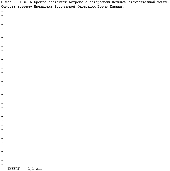 Допустим, в файле note сохранен текст записки: В мае 2001 г. в Кремле состоится встреча с ветеранами Великой отечественной войны. Откроет встречу Президент Российской Федерации Борис Ельцин. Если ситуация изменилась (и мы отдаем себе отчет, как именно), можно открыть файл с этим текстом в текстовом редакторе, например, vi (Рис. 1), и издать команду: :s/Борис Ельцин/Владимир Путин/g Текст (предсказуемо) приобретет вид: В мае 2001 г. в Кремле состоится встреча с ветеранами Великой отечественной войны. Откроет встречу Президент Российской Федерации Владимир Путин. Однако, то же самое действие можно выполнить и «без редактора», а точнее, без интерактивного редактора, с помощью редактора $sed -n 's/Борис Ельцин/Владимир Путин/g' note Если у нас подготовлен не один файл, а множество (например, note.1, note.2, note.3), и нужно внести в них единообразные замены (и ничего не пропустить, и нигде не ошибиться), мы обойдемся также всего одной командой. $sed -n 's/Ельцин/Березовский/g' note.* Если файлов будет тысяча, а требуемые изменения будут посложнее, нам, скорее всего, понадобится опять-таки всего одна команда (хотя, возможно, и потребуется серьезное изучение синтаксиса). Это называется потоковым редактированием, и оно интенсивно применяется, например, для наложения «заплаток» на исходные тексты программ (однако, как было продемонстрировано, с успехом может использоваться и для обработки текста на естественном языке). Автоматизированная обработка текстов ОС «Юникс» была во многом «рождена для обработки текстов» (прежде всего, это была система для программистов, а программы — это тексты). Набор служебных программ (утилит) современных стандартных ОС продолжает эту традицию, и в их составе можно найти десятки программ, ориентированных на работу с текстом. Многие из них (но не все) являются построчно-ориентированными, то есть текст понимается как последовательность строк. Команда «grep» выводит строки, содержащие заданную подстроку, команда «sort» сортирует строки по алфавиту, «uniq» удаляет неуникальные (дублирующиеся) строки, «split» разделяет файлы, «cat» соединяет и т.п. Подробное описание команд потоковой обработки текста может занять отдельную толстую книгу. В стандартной операционной среде отдельные утилиты могут «склеиваться» с помощью рассмотренных выше штатных средств оболочки операционной системы (перенаправление ввода-вывода, конвейер), что позволяет гибко решать самые сложные задачи обработки текстов, не прибегая к программированию на специальных языках, компилированию и сборке программ. Базовые регулярные выражения Многими стандартными утилитами (такими как «sed», «grep», «vi») для поиска, замены, выбора текста, используются базовые регулярные выражения. Регулярное выражение — это последовательность символов. При использовании (передаче в качестве аргумента программе или вводе в ходе сеанса редактирования) регулярное выражение (шаблон) обычно[60] окружается ограничителями — двумя одинаковыми символами, обозначающими его начало и конец, но не являющимися частью самого выражения. За исключением особых случаев в качестве ограничителей принято брать прямую косую черту (/, слэш), она окружает выражения и во всех нижеприведенных примерах. Сами же символы могут (в зависимости от значения и, иногда, положения) иметь прямое (буквальное) значение или специальное. Символ-огран