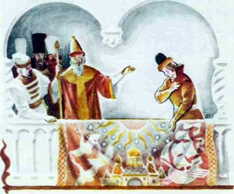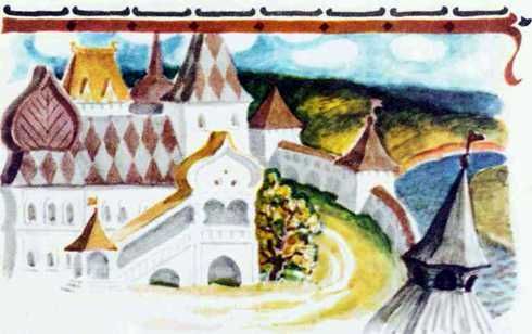 Уложила его спать, а сама сбросила лягушечью кожу — и обернулась душой-девицей, Василисой Премудрою; вышла на красное крыльцо и закричала громким голосом: — Мамки-няньки! Собирайтесь, снаряжайтесь шёлковый ковёр ткать — чтоб таков был, на каком я сиживала у родного моего батюшки!
