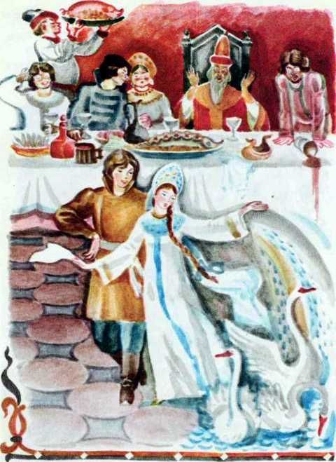 Говорит Иван-царевич: — Как мне за себя квакушу взять? Квакуша не ровня мне! — Бери! — отвечает ему царь. — Знать, судьба твоя такова. Вот поженились царевичи: старший на боярышне, средний на купеческой дочери, а Иван-царевич на лягуше-квакуше. Призывает их царь и приказывает: — Чтобы жёны ваши испекли мне к завтрему по мягкому белому хлебу. Воротился Иван-царевич в свои палаты невесел, ниже плеч буйну голову повесил. — Ква-ква, Иван-царевич! Почто так кручинен стал? — спрашивает его лягуша. — Аль услышал от отца своего слово неприятное? — Как мне не кручиниться? Государь мой батюшка приказал тебе к завтрему изготовить мягкий белый хлеб. — Не тужи, царевич! Ложись-ка спать-почивать; утро вечера мудренее! Уложила царевича спать да сбросила с себя лягушечью кожу — и обернулась душой-девицей, Василисой Премудрою; вышла на красное крыльцо и закричала громким голосом: — Мамки-няньки! Собирайтесь, снаряжайтесь, приготовьте мягкий белый хлеб, каков ела я, кушала у родного моего батюшки. Наутро проснулся Иван-царевич, у квакуши хлеб давно готов — и такой славный, что ни вздумать, ни взгадать, только в сказке сказать! Изукрашен хлеб разными хитростями, по бокам видны города царские и с заставами. Благодарствовал царь на том хлебе Ивану-царевичу и тут же отдал приказ трём своим сыновьям: — Чтобы жёны ваши соткали мне за единую ночь по ковру. Воротился Иван-царевич невесел, ниже плеч буйну голову повесил. — Ква-ква, Иван-царевич! Почто так кручинен стал? Аль услышал от отца своего слово жёсткое, неприятное? — Как мне не кручиниться? Государь мой батюшка приказал за единую ночь соткать ему шёлковый ковёр. — Не тужи, царевич! Ложись-ка спать-почивать; утро вечера мудренее!