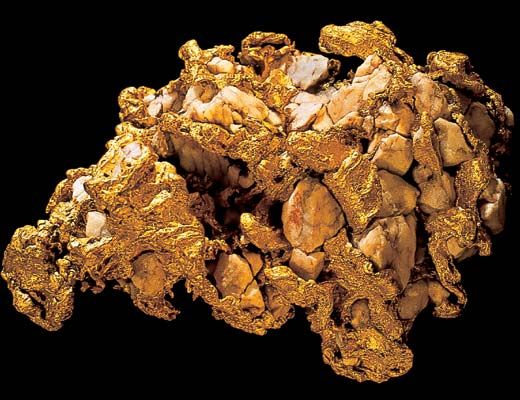 С той поры как минул каменный век, человечество раз и навсегда отдало свои предпочтения металлам, которые стали фундаментом современной цивилизации. Но путь к основам металлургии был долог, и, прежде чем научиться добывать и плавить руду, люди познакомились с чудесными свойствами металлов, находя и обрабатывая самородки. При одном только упоминании о самородках в воображении большинства людей тотчас возникает золото. Между тем самородными могут быть многие металлы, в том числе и такие обыденные, как медь и железо. Причем самородное железо – явление куда более редкое, чем самородное золото. Тысячи лет люди знакомы с самородными металлами, но по сию пору среди специалистов нет единого мнения об их происхождении. Споры длятся давно, и сегодня подавляющее большинство геологов придерживаются теории, согласно которой самородки создаются гидротермальными подземными водами, богатыми солями металлов. Эти горячие растворы, поднимаясь из недр нашей планеты, охлаждаются и, постепенно осаждаясь в пустотах горных пород, образуют в трещинах земной коры, кварцевых жилах скопления самородков. Впрочем, ученые не сомневаются в том, что существуют и другие механизмы их образования. Само понятие «самородок» пока не получило общепризнанного определения. По терминологии, принятой в нашей стране, самородком можно считать сравнительно крупное обособление самородного металла весом свыше 1 г. Самым желанным в обширном классе самородных металлов для человека было золото. Находки самородного золота известны на всех континентах (за исключением Антарктиды), но особую славу снискала Австралия из-за так называемой «Плиты Холтермана» – глыбы кварца, содержавшей более 90 кг самородного золота. Самородное золото, как правило, включает разнообразные примеси. Обычно это медь, серебро, железо, свинец. Характер и количество примесей во многом определяют цвет самородков, который может меняться от ярко-желтого, до красноватого, а порой приобретает даже зеленоватые оттенки. Золотые самородки находят как в россыпях, так и в коренных месторождениях. В россыпях самородки обычно окатываются, деформируются, приобретают сглаженные, округлые формы. Наиболее причудливые самородки извлекают из коренных месторождений, где благородный металл повторяет форму тех полостей, в которых происходило его накопление. Заполняя трещины вмещающих пород, самородки чаще всего образуют плоские фигуры – дендриты или разнообразной формы зерна с различными выступами и наростами. Наиболее крупным самородкам принято давать имена. Самым большим русским самородком считается «Большой треугольник» весом 36,2 кг, найденный в 1842 году на Южном Урале. В Алмазном фонде хранятся уникальные самородки: самый маленький – «Мефистофель» (20,25 г), «Заячьи уши» (3,34 кг), «Верблюд» (9,29 кг). Однако чаще всего золотые самородки – это чешуйки, пленки, зернышки, проволочки, весящие лишь несколько граммов. Большинство геологов и геохимиков сходятся во мнении, что самородное золото может образовываться различными путями. Своим возникновением золотые самородки обязаны не только термальным водам. Там, где золотосодержащие руды омываются кислыми подземными водами, постепенно концентрируются значительные скопления самородков. В последнее время все чаще ученые говорят о большой роли в процессах накоплени