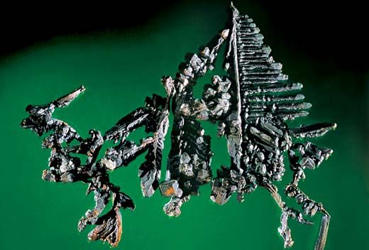 Извечным соперником золота всегда было серебро, которому порой даже случалось затмить блеск желтого металла. Хотя серебра в недрах Земли значительно больше, чем золота, в виде самородков оно встречается довольно редко. С белым, ковким, пластичным металлом человек познакомился еще в бронзовом веке, разрабатывая месторождения меди, которым нередко сопутствовали проявления серебра. Однако в россыпях самородки этого металла встречались нечасто. Так же, как и золото, самородное серебро в основном образуется в гидротермальных жильных месторождениях, возникновение которых обычно связано с вулканической деятельностью, внедрением в горные породы гранитной магмы. Именно древние вулканы Америки создали целую цепь богатейших месторождений Перу, Боливии и Мексики. Чаще всего самородное серебро представляет собой покрытые черной пленкой тонкие неправильной формы пластинки, листочки, иногда проволокообразные сростки, зернышки, реже – кубики и октаэдры. Но порой серебряные самородки – это колоссальных размеров глыбы металла. Как место добычи крупнейшего серебряного самородка прославились Рудные горы, расположенные на стыке Германии и Чехии. Здесь в 1477 году на руднике «Святой Георгий», что в окрестностях немецкого города Фрайберга, нашли огромный серебряный самородок. Еще в шахте исполин был превращен в импровизированный стол, который накрыли к праздничному обеду для герцога Альбрехта. По окончании трапезы самородок, размеры которого составляли 1х1х2,2 м, раскололи на части, подняли на поверхность. Его вес оказался 20 тонн. Сегодня наиболее значимые месторождения самородного серебра находятся в Норвегии, Канаде, Мексике, Германии. В нашей стране самородное серебро добывают на многочисленных месторождениях Дальнего Востока, открытых в середине прошлого века.