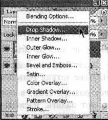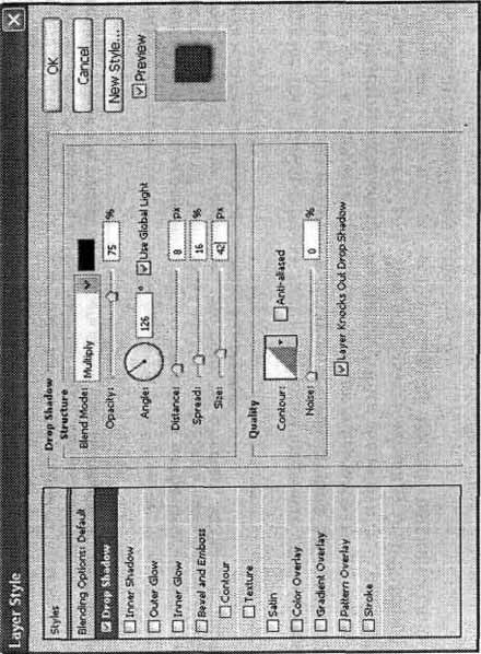 Рис. 11.13. Меню доступа к слоевым эффектам При вызове команды Drop Shadow (Тень) на экране появится окно, показанное на рис. 11.14. В его левой части расположены флажки, позволяющие включать и выключать отображение различных слоевых эффектов. При щелчке на названии флажка в правой части окна отображается набор элементов, связанных с этим эффектом. Задайте параметры эффекта, при установленном флажке Preview (Просмотр) вы сможете наблюдать будущий эффект прямо в окне изображения. Теперь измените направление, в котором отбрасывается тень. Для этого при помощи мыши поверните указатель Angle (Угол) или введите значение в расположенном рядом поле ввода. ПРИМЕЧАНИЕ. Правильнее будет сказать, что задается направление, из которого исходит свет. При установленном флажке Use Global Angle (Использовать общий угол) изменение значения угла сказывается на всех эффектах, примененных к текущему слою. Снимите этот флажок, если такое влияние нежелательно.