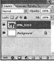 Рис. 11.8. Вид панели Layers для изображения, содержащего фон и один слой Символ слоя, находящийся на панели, содержит следующие элементы: Символ видимости слоя — щелкнув на нем мышью, можно отключить отображение слоя на экране и его воздействие на другие слои изображения; для включения слоя, щелкните на месте, на котором находился символ видимости (при отключении слоя символ видимости также убирается с панели). Отметка редактирования слоя — слой, с которым вы работаете в данный момент, выделяется на панели Layers (Слои) цветом, так же как выделяется выбранный пункт меню или списка. Символ маски слоя — если слой имеет маску, рядом с уменьшенным изображением находящегося на слое изображения будет отображаться уменьшенная копия маски. Щелкая по этим изображениям, вы можете переключаться между редактированием самого слоя или присвоенной ему маски. ПРИМЕЧАНИЕ. Маска слоя позволяет скрыть некоторые части изображения, находящегося на слое, не удаляя их. Маска может редактироваться как обычное изображения в режиме Grayscale (Оттенки серого). Маски слоя полезны при создании сложных коллажей или специальных эффектов, но используются в довольно сложных проектах, поэтому здесь мы их рассматривать не будем. Вы можете прочесть о них в одном из подробных руководств по использованию Adobe Photoshop CS 2. Символ связи с другими слоями — указывает на то, что данный слой связан с другими слоями; если один из связанных слоев выделен как текущий (выбран для редактирования), для связанных с ним слоев будут отображены эти символы. Можно включить связь, выделив несколько слоев на панели Layers (Слои) и вызвав команду Link Layers (Связать слои) из меню панели. Еще более простой способ включения и отключения связи между слоями — специальная кнопка, находящаяся в нижней части панели Layers (Слои). ПРИМЕЧАНИЕ. Связанные слои в некоторых случаях обрабатываются одновременно. Например, находящиеся на них изображения синхронно перемещаются при применении инструмента Move (Переместить). К связанным слоям применимы команды меню Layer • Align Linked (Слой • Выровнять связанные слои) и Layer • Distribute Linked (Слой • Распределить связанные слои), позволяющие выравнивать находящиеся на слоях фрагменты изображения или равномерно распределять их вдоль заданного направления. Кроме того, команда Layer • Merge Linked (Слой • Объединить связанные слои) позволяет объединить все слои, связанные с текущим слоем, в один. В Adobe Photoshop CS 2 можно выделить несколько пунктов панели Layers (Слои). Для этого щелкайте на них, удерживая нажатой клавишу Ctrl. Также можно щелкнуть на первом пункте, который вы собираетесь выделить, после чего нажать клавишу Shift и щелкнуть на последнем из следующих друг за другом слоев, которые вы собираетесь добавить к выделенной группе. Для выделенного набора слоев можно включить связь между слоями (см. выше). Кроме того, можно синхронно перемещать изображения, находящиеся на связанных слоях, так, как если бы связь была включена, но при этом слои останутся связанными до момента снятия выделения с пунктов панели Layers (Слои). На панели также находится несколько кнопок блокировки, которые позволяют блокировать параметры и режимы редактирования слоя. Кнопки (слева направо) позволяют заблокировать прозрачность слоя, использование рисующих инструментов, перемещение изображения по слою или все параметры одновремен. 
