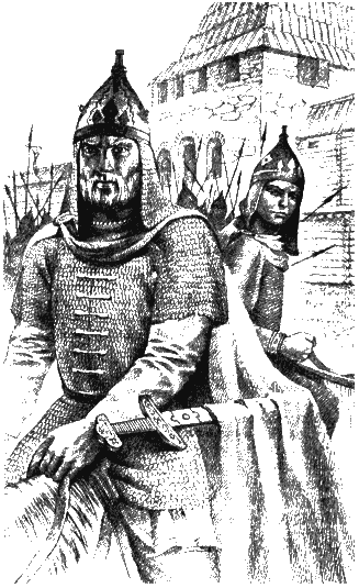 "Преданье старины глубокой (с иллюстрациями)" - читать интересную книгу автора (Губарев Виталий Георгиевич)ВЕЛЬМИ ВЕЛИКАЯКнязь Олег торопился выступить в поход: кончался месяц травень[29], а путь до Киева немалый. Надо бы завершить все ратные дела за лето, пока жарко светит ярило, а короткие дожди и грозы не страшны воинам — только охлаждают разгорячённые тела. До глубокой ночи заседал в Большой палате совет военачальников. Усталые воеводы докладывали князю о готовности своих отрядов к походу, прихлёбывали из серебряных чаш прохладные напитки, кои то и дело разносили с поклоном княжеские холопы. Тёзки, два Игоря, и Таня стояли позади Олегова кресла и видели, как воеводы утирают рукавами потные лица. Напитки прохладные, а все одно — жарко. Горят в Большой палате тридцать светильников, от них веет теплом, будто от очага. В самом углу примостился старый Блюд — новый главный волхв Великого Новгорода. Неотрывно смотрит он на князя Олега, а когда встречается с ним глазами, угодливо улыбается. Никогда не забыть Блюду, как расправилось вече с его предшественником Фарлафом — мороз по коже пробирает! За то, что занёс Фарлаф руку на юного князя, за то, что хотел принести Перуну человеческие жертвы, кои строго-настрого запрещены на Руси, до смерти забили его палачи плетьми. Но старый Блюд знает и другую причину жестокой казни, как знают и все сидящие здесь воеводы. Знают, да только вслух не говорят: слишком часто Фарлаф поступал наперекор княжеской воле, хотел сильнее князя быть! Вот в чём наиглавная причина… Потому и улыбается угодливо князю Олегу волхв Блюд — старая лиса! Князь Олег поднялся с кресла: — Братие! Всех вас я выслушал, воеводы смелые! Все ныне проверено и обдумано, готовы щиты и кольчуги, наточены мечи и копья, натянуты луки, припасены стрелы. Стоят на Волхове и Ильмень-озере сотни боевых лодий, кои потащат волоком до Днепра наши вои. Ржат повсюду в Великом Новгороде резвые кони, ждут всадников. Время в поход выступать! — Князь умолк на несколько секунд и покосился на Блюда: — А что о сём думает главный волхв? Воеводы задвигались, обернули бородатые лица на волхва. В их хитроватых глазах засветились чуть приметные выжидательные усмешки. Блюд вздрогнул и поднялся, тряся длинной бородой. — Перун, о княже, указует тебе перстом своим путь на Киев… Воеводы посмеивались в усы, опустив глаза. — Да будет так! — сказал князь Олег. — Будем поторапливаться, братие, покуда вражеские видоки не дали знать о планах наших Аскольду и Диру и покуда не знают о сём германцы на западе и хазары на востоке. Могут князья Аскольд и Дир заручиться их помощью. Мыслю я, что возьмём мы киевских князей малой кровью, ратной хитростью. Рано утром, как взойдёт ярило, выходим в поход за Русь великую! За вельми великую Русь от моря Русского до окияна Ледового! …Раным-рано на зорьке запел-загремел на высокой новгородской звоннице вечевой колокол. Таня с братом не слышали его: крепко спали, утомлённые всем пережитым и увиденным. Их разбудил возбуждённый, раскрасневшийся князь Игорь. Звеня ладно сделанными по росту доспехами, в шлеме с голубым еловцем[30] на его острие, с малым мечом на поясе, он бы великолепен! Игорь свесил с постели ноги, протёр глаза и только рот открыл от восхищения. — Скорей, братие! — торопил князь. — Дядя берет меня в поход на полудень! Приспел час прощат