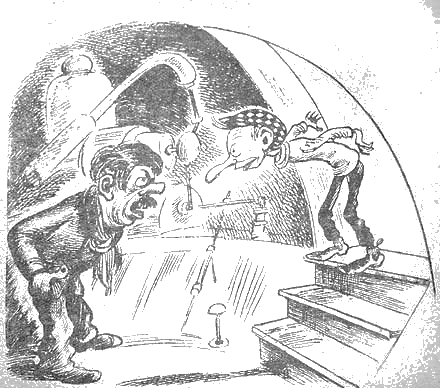 Аноним Как Сима возвратился с МарсаВсе знают, что я, Симочка, не умею лгать. Так меня, Симочку, воспитала мать. Ко мне, Симочке, относятся все любовно. Мне, Самочке, верят беспрекословно. Надеюсь, что и на этот раз дышать будет правдою мой рассказ. Случилось со мной… Ой-ой-ой!.. У дяди был старый кот, а у кота заболел живот. (Кот вообще напоминал калеку). И вот послал меня дядя в аптеку. Иду это я мимо какого то знания, вдруг слышу странное завывание. Невольно открыл калитку и вижу — алюминиевая площадка, а в самом центре с хвостом кометы какие то странные стоят предметы. А рядом, под крышей большого ангара, в чушуйчатой броне гигант-сигара. В сигаре отверстие, глубокий люк и странная дверь — точно острый утюг. Нос у меня вы знаете, довольно длинный, точь в точь, как аппарат минный. Ну, и естественно я не мог удержаться, чтобы носом в прибор не забраться. А там я и сам весь в сигару влез и за утюгообразною дверью исчез. Вдруг слышу: — Сюда не разрешается входить без спроса даже с таким длинным носом. Вылезай немедленно, пока не бит. А у сторожа такой был свирепый вид, что от страху я задрожал, упал и какую то кнопку нажал.