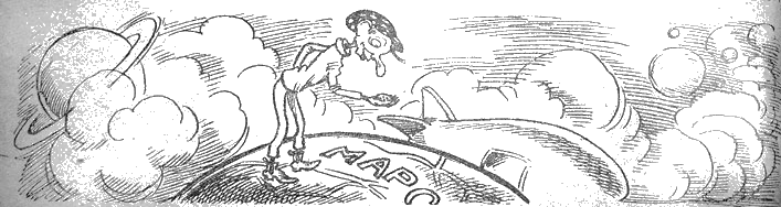 Только нажал, как захлопнулась дверь и аппарат зарычал точно зверь. Загремели пружины, заохало и заахало и вдруг как из пушки трахнуло. Трахнуло, как из пушки, и дыбом поднялся мой чуб на макушке. Мой клетчатый кепи свалился при этом и все озарилось пурпурным светом. Я лег на живот и пополз к окошку, напоминая походкою дикую кошку. Гляжу, а подо мной уже нет ничего. Земля осталась где-то в неизмеримейшей глубине, где-то в пропасти на самом дне. Даже не было облаков. Не было ничего, кроме фиолетово-синего света… Так быстро унесла меня от земли ракета. Я летел, глаза вытаращив от изумления, в неизвестнейшем направлении… А где то, теперь уже почти в другом мире, где зеленью покрыты горы, где нивы, колхозы, заводы, реки, дядя ждал моего возвращения из аптеки. Ждал, поглаживал по спине кота Барса, поглаживал, приговаривая: — Потерпи, потерпи, милый Барс… А я… Я вместо аптеки летел на Марс. Сколько летел, как летел — теперь не припомню, забыл. Одно лишь помню, как аппарат мой ужасно выл. И басом, и дискантом он гудел над ухом, а я все лежал и лежал вниз брюхом. Можете себе представить — я даже толчка не слыхал. Вылез и улыбаюсь себе. — Нахал! Никто меня на Марс не звал, а я тут как тут. Подумал: — А что, яблоки тут растут? Смотрю — вокруг песочек, камешки и пуговица от штанов лежит. У пуговицы самый смиренный вид: кругленькая, посредине пупырочка и самая обыкновенная дырочка. Схватил я ее и думаю: «Значит, Марс обитаем. Вот это так трюк!» А эта пуговица, оказывается, от моих же брюк. Думала ли тетя, когда ее пришивала чтобы она (не тетя, а пуговица) на Марс попала? Ну, и прожил я на Марсе до конца второй пятилетки. Ходил там несменно в клетчатой своей кепке, питался там как умел, но не хныкал и не ревел.