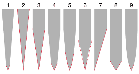 1 — клиновидные спуски от самого обуха, традиционная режущая кромка. Одна из самых распространённых форм для кухонных ножей. Очень легко режет толстые слои материала; 2 — клиновидные спуски, начинающиеся от обуха, которые непосредственно образуют режущую кромку. Достаточно распространённая форма, однако в процессе переточки практически всегда переходит в вид 1. Ввиду большой площади спусков при точке брусок «замасливается» посторонним металлом, поэтому правильно наточить такой нож гораздо сложнее, чем вариант 3. Разумеется, после точки ножа требуется полировка боковых поверхностей, если его внешний вид важен для владельца; 3 — плоское лезвие, клиновидные спуски образую режущую кромку, начинаясь от середины или двух третей ширины лезвия (считая от обуха). Очень характерная форма для множества универсальных национальных ножей, особенно скандинавских. В продаже встречается часто, очень легко точится, так как плоскости спусков задают угол заточки, имея при этом сравнительно небольшую площадь; 4 — плоское лезвие, клиновидные спуски, традиционная режущая кромка. Самый распространённый вариант профиля. Позволяет варьировать угол заточки. Нож достаточно прочен, сравнительно легко режет; 5 — плоское лезвие, клиновидные спуски, режущую кромку образует двойной клин. Если в варианте 4 клин режущей кромки одинарный, то в варианте 5 часть материала с углов между спуском и кромкой убрана. В результате, при разрезании толстых и плотных материалов нож испытывает меньшее сопротивление. В заводских изделиях почти не встречается, но можно рекомендовать как основную людям, хорошо освоившим ручную заточку ножей; 6 — плоское лезвие, линзовидные вогнутые спуски. Угол режущей кромки образован продолжением двух плоскостей, проведённых от грани между лезвием и спуском к острию. Такую заточку ещё называют «бритвенной» — она характерна для опасных бритв. Легко точится и правится — грань между лезвием и спуском служит «направляющей» для определения угла заточки. Сами спуски могут начинаться практически от обуха. Нож очень хорошо режет сравнительно тонкие материалы, хуже — более толстые (из-за наличия грани), Из-за массивности обуха или самого лезвия нож имеет значительную жёсткость; 7 — «стамесочная» или односторонняя заточка. Она характерна для национальных японских ножей. Относительно просто затачивается, если кромка не сильно повреждена. Минус — нож предназначен только под одну руку, скос должен быть со стороны рабочей руки. В данном случае изображено лезвие для правшей (если считать, что мы смотрим на лезвие со стороны ручки); 8 — фактически представляет из себя вариант 3, только угол режущей кромки таков, что спуски как таковые отсутствуют. Форма лезвия характерна для дешёвых китайских подделок под фирменные ножи, а также для всякого рода рубящих орудий; 9 — «оживальная», или «пулевидная» заточка. Характерная особенность — выпуклые линзовидные спуски. Режет не очень хорошо, вязнет в материале, зато прекрасно рубит. Разумеется, такие ножи сложнее и дороже в изготовлении и заточке, нежели вариант 8. Большинство высококачественных кухонных ножей имеют спуски, начинающиеся практически от обуха, и небольшую тонкую режущую кромку. Соответственно, процесс заточки как раз и заключается в формировании правильной режущей кромки. Идеальная её ф