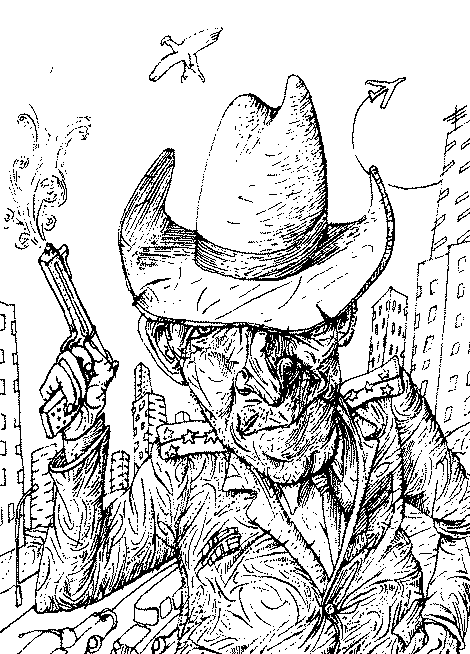 Мортимер Морз, картежник, выпивоха и задира, но при этом один из трех лучших стрелков на всем Западном побережье (Морти до сих пор не стал Номером Один лишь потому, что двое других претендентов старательно избегали встречи с ним), проснулся в ужасном расположении духа. Во-первых, он почувствовал, что замерз. В конце лета ночи все еще теплые, но под утро становится зябко. К тому же, как выяснилось, спал он без одеяла. На голых досках. Во-вторых, страшно болела голова. А во рту было сухо, как в сожженном зноем сердце пустыни Невада. Выпил он накануне не так много, но, видно, домашний самогон, которым потчевали его мормоны, оказался не лучшего качества. В-третьих, жутко воняло. Морти не был неженкой. Как-то раз, пережидая внезапно налетевшую песчаную бурю, он два дня кряду пролежал под боком у дохлой лошади со вздувшимся, как от водянки, животом. Ел, пил и справлял нужду, не сходя с места. И — ничего. Но сейчас воняло чем-то настолько омерзительным, что хотелось прижать к лицу мокрый платок и бежать прочь без оглядки. Потому что так отвратно смердеть могло лишь в одном месте — в геенне огненной, где сам Сатана тыкает грешников вилкой в бок, проверяя, хорошо ли они прожарились. Мортимер Морз не верил ни в рай, ни в ад, но скользкая, необъяснимая жуть пробралась к нему в грудь и холодным кольцом обвилась вокруг сердца. Никогда прежде Морти не испытывал ничего подобного. Даже когда Джерри О’Салливан, которого все называли просто Безумный Джерри, держал его на мушке винчестера и глумливо улыбался набитым гнилыми зубами ртом, а у Морти имелся только кольт со сбитым прицелом и расколотой рукояткой, да и тот засунут сзади за пояс. Морти с ужасом открыл глаза. Высоко над ним лениво тянулись невесть куда облака, похожие на клочья старых газет, которыми протирали стекла. Небо было грязно-серого цвета. Будто прокопченный полог старой палатки. Морти никогда прежде не видел такого. Руки сами собой легли на пояс. И вот тут-то Мортимеру Морзу стало по-настоящему страшно. Обе кобуры оказались пусты. Морз рывком поднялся и сел. Выходит, он спал не на дощатом полу, а на садовой скамейке с узкой, в одну доску, спинкой. Скамейка стояла на краю дорожки, вымощенной странным материалом, похожим на плотно утрамбованный песок, только непривычно серого цвета. Морти вытянул ногу и постучал по дорожке каблуком — такое ощущение, будто под ногами камень… Дорожка бежала меж чахлых кустиков и рахитичных деревьев с обломанными ветками. По краям ее стояли такие же скамейки, как и та, на которой спал Морти, и небольшие жестяные короба. Выкрашенные в грязно-розовый цвет, они смахивали на разломанные почтовые ящики. Временами дорожка ветвилась. Те ее рукава, что убегали влево, вели к очень высокой желтой стене — по всей видимости, это хорошо укрепленный форт. Вот только чего ради в этой стене прорезано огромное количество больших, застекленных окон и понавешаны балкончики, заваленные всевозможным хламом? Ведущие в другую сторону дорожки скрывались в зарослях невысокого кустарника, из-за которого то и дело доносились резкие, рыкающие звуки. Настолько необычные, что сразу становилось ясно, ни одна живая тварь не способна издавать такие. Даже смертельно раненая. Морз потряс головой, отгоняя дурацкие мысли. Определенно, это не ад… Но что же тогда? Морти призадумался, пытаясь подобрать опред