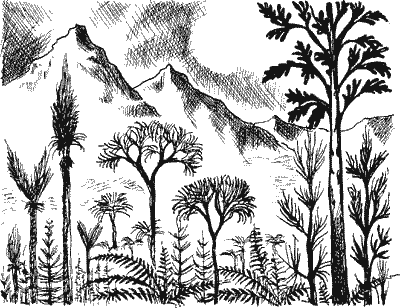 Перистые канделябры, гигантские пушистые хвосты, чудовищные шишки листьев по концам развилин и ажурные, тончайшей работы кружева ветвей, похожие на пальмы, но с рисунком изящней и нежней, заткали пылающий небосвод в сорока — пятидесяти метрах над моей головой. Это была буйная флора примитивов. Мхи, плауны, хвощи и папоротники наших дней довольствуются положением, мало отличным от удела трав. Грибы, как известно, тоже не претендуют на видное место в современном учебнике ботаники. Но здесь эти растительные чудовища, насквозь пропитанные дурно пахнущей гнилой водой, превзошли по пышности величавую и расточительную щедрость нынешних тропических лесов. Я засмотрелся на прямые, как колонны, без ветвей сигиллярии, похожие на ламповый ершик с густой щетиной из листьев, потом перевел взгляд на рубчатые стволы лепидодендронов с редкими, похожими на растопыренные пальцы ветвями. А позади меня тонула в красноватой мгле поросль гигантских тридцатиметровых каламитов, похожих на тысячекратно увеличенные хвощи. Каламиты поднимали над водой десятки ярусов палочковидных звездчатых ветвей, кружками опоясывавших ствол. Это были потомки и преемники псилофитов. Они заселили все пространство: и открытые воды, и заболоченные почвы. Земля этого периода почти не знала солнечных лужаек и полян, а если изредка они и попадались, то их спешили захватить древовидные семенные папоротники и усыпанные иглами исполины кордаиты, ставшие впоследствии предками наших хвойных. Эти размножавшиеся спорами чешуйчатые гиганты, отмерев, падали пластами на дно болот, озер и заболоченных заливов. Веками они заносились осадками и уплотнялись, покрывались сверху новыми пластами и все больше сдавливались и спрессовывались, пока, вовлеченные в круговорот химических превращений, не обращались многие десятки миллионов лет спустя в плотный блестящий антрацит. Тучи над лесом разгорались, будто объятые пожаром, а с запада, все нарастая, надвигался гул, перемежающийся по временам с гневным грохочущим рокотом. Огненный смерч на западе дрожал и вибрировал, и среди чернильных пятен и штрихов, которыми был испещрен весь участок леса, тут и там на глянцевитых со струпьями стволах плясали и кривлялись зловещие блики. «Теперь достаточно света», — подумал я и ступил на зыбкую почву девственного леса. По щиколотку погружаясь в жижу, с трудом вытаскивая ноги, я медленно пошел между стволами прямо вперед, навстречу свету, балансируя, чтобы не потерять равновесия. Впереди громоздились поваленные полусгнившие стволы. Глаза постепенно привыкали к красному сумраку, я стал лучше видеть. Величавость и суровость этого леса действовали угнетающе. Напрасно было бы искать в нем светлую веселую листву или хотя бы скромно окрашенные цветы. Не было и пестрокрылых бабочек, суетливых шмелей и пчел, невозможно было бы увидеть и ярких жуков, хотя лес изобиловал насекомыми от корней и до вершин. Не успев сделать и десяти шагов, я наткнулся на лесного клопа-левиафана величиной с перепела и тут же поспешно отпрянул в сторону, потому что увидел спускавшегося на меня громадного паука. Он висел, покачиваясь, с растопыренными коленчатыми ногами, на конце толстого, сверкавшего рубиновыми искрами шнура. Мне на мгновение представилось, что, попав в соответствующего размера паутину, человек мог бы запут