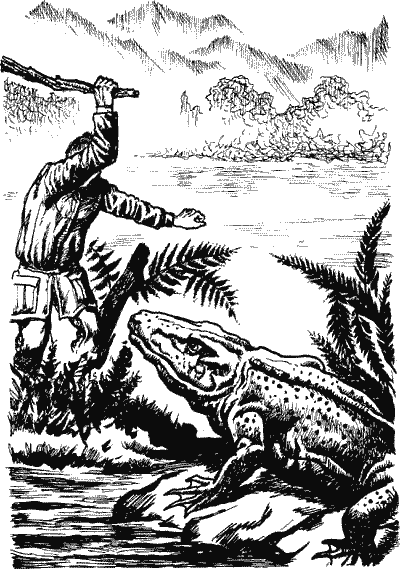Тут он набросился на меня. Я увернулся и изо всех сил треснул его палкой по спине. Стегоцефал только ухнул, неуклюже повернулся и напал снова. Тогда я стал колотить его по чему попало, пока случайно не повредил ему глаз. Он завертелся от боли, хватая зубами стволы растении и перемалывая их в щепы. Так я и оставил его беснующимся, вертящимся по кругу — чудовищную зубастую лягушку с коротким толстым хвостом и уродливыми-маленькими лапами. Скоро его скрыли от меня деревья, и только злобное уханье и бульканье еще долго преследовало меня. Вдруг я увидел сразу трех дипловертебронов. Эти существа не превышали двух третей метра. Они безмятежно нежились над водой на большой коряге упавшего каламита и смотрели на меня сонными глазами. Их короткие хвосты свисали в воду, и, если бы светило солнце, можно было бы подумать, что они специально приползли сюда принять солнечные ванны. У самой воды в развилке корней гигантского лепидодендрона неподвижно лежало животное, похожее и на рыбу и на земноводное. Его тело было толстым и плоским, с крохотными лапками. Я не без труда узнал в нем эогиринуса. Передние лапы были хорошо видны, но задней половины туловища не было совсем, она точно была отрублена топором. Эогиринус был бездыханен, с впавшими мутными глазами. А между тем эта тварь даже для земноводного имела внушительные размеры — свыше четырех с половиной метров, и справиться с ним мог только еще более крупный хищник. Я не стал задерживаться возле жертвы богатырского аппетита и, повернувшись, едва не попал в предусмотрительно открытую пасть эриопса. Полутораметровый панцирноголовый гад с короткими толстенькими ножками являлся образцом бесчисленных живых капканов, усеивавших все леса на планете и подстерегавших свой обед в молчании и неподвижности. |