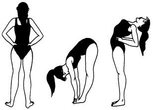 Это упражнение помогает усилить и привести в норму кровообращение в области спины. Исходное положение: встаньте прямо. Большими пальцами рук медленно массируйте участки спины в области поясницы с обеих сторон вдоль позвоночника, представляя себе, как тело, размягчаясь, становится более гибким. Затем энергично, но плавно, а не резко, наклонитесь вперед, стараясь достать руками пол. Выпрямитесь и согнитесь назад как можно ниже — тоже плавными, мягкими движениями, не рывком. Снова выпрямитесь и сделайте несколько энергичных, но мягких наклонов вправо-влево. Делайте упражнение каждый день.