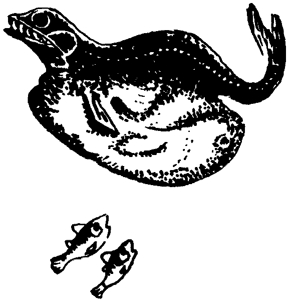 "Путешествие вверх" - читать интересную книгу автора (Фёдоров Вадим Дмитриевич)Глава третья, в которой Долопихтис продолжает поиски рыбки с откусанным хвостом и находит другаОднажды Долопихтис встретился с рыбкой, подвижной и на вид безобидной. Но Долопихтис узнал её сразу: «Чёрный Пожиратель!» Небольшая тёмная рыбка, лишённая декоративной свирепости, с головой допотопного ящера, внушавшая скорее отвращение, чем страх, каким-то неизвестным приёмом убивала и заглатывала рыб, превышающих её собственные размеры. Поэтому Долопихтис внимательно наблюдал за чёрным разбойником, справедливо полагая, что это может оказаться нелишним. Чёрный Пожиратель плыл, казалось не обращая внимания на удильщика. Однако слишком часто он менял направление своего движения и один раз даже сделал большой круг около Долопихтиса, пытаясь рассмотреть получше, кто плывёт за ним вслед, и определить, что из этого может получиться. Неизвестно, какое впечатление произвела на него светящаяся улыбка удильщика, но он поплыл дальше, не проявляя больше к Долопихтису ни малейшего интереса. Некоторое время Долопихтис и Чёрный Пожиратель плыли, не встречая рыб, достойных внимания, пока наконец не увидали трёх крупных рыб. Длинные, зубастые, с острыми плавниками, они неслись вперёд, ни на кого не обращая внимания. В то же мгновение Чёрный Пожиратель, свернув с дороги, бросился в сторону и, подплыв сбоку к одной из рыб, заюлил вокруг, стараясь держаться около её головы. Удивлённая такой назойливостью, рыба отстала от своих товарок и несколько раз пыталась схватить дерзкого приставалу, но тот каждый раз увёртывался, не отставая от рыбы и мешая ей плыть. И в одно из мгновений, когда ошеломлённая рыба после очередного промаха захлопнула пасть, чёрный разбойник, вынырнув из-под неё, вцепился рыбе в голову так, что её пасть оказалась как бы на замке. Рыба сделала несколько резких движений, пытаясь стряхнуть с себя хищника, но не тут-то было: Чёрный Пожиратель держал её крепко.
