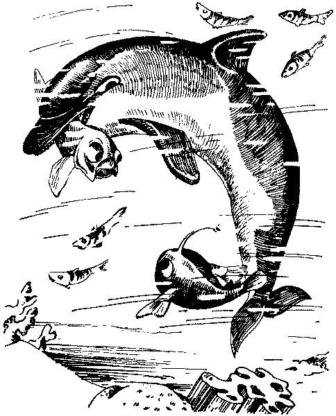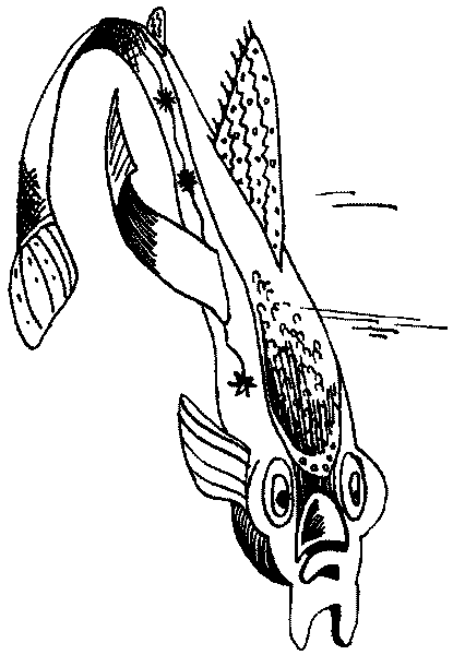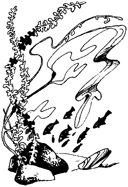 — Скажите, не могли бы вы помочь мне разыскать мельчайшие растения по имени водоросли? — обратился удильщик к пучеглазой маленькой рыбке с большими опущенными плавниками. И поспешно добавил: — Сам я из семейства удильщиков и специально приплыл наверх, чтобы познакомиться с ними. — Это не так просто, — важно ответила рыбка. — Во-первых, потому, что их нельзя увидеть — они слишком мелки, а во-вторых, и это имеет прямое отношение к цели вашего визита, водоросли и все другие растения не разговаривают, как мы, рыбы. И, наконец, в-третьих, что представляется мне особенно важным, так это моё имя. Но я, с вашего позволения, пока его сообщать не буду. — Что же мне делать? — огорчённо воскликнул Долопихтис. — Мне очень хочется узнать, чем занимаются водоросли. — Я думаю, и это должно быть для вас очень важно, что они кормят собой копепод. — Не очень-то интересное занятие — кормить кого бы то ни было собой. Неужели их жизнь столь безрадостна? — воскликнул удильщик. — Великое счастье — самопожертвование, — нравоучительно произнесла пучеглазая рыбка. — Боюсь, что я не смогу оценить величие самопожертвования до конца, — вздохнул удильщик, которого начинали раздражать манеры пучеглазой рыбы, пожелавшей сохранить инкогнито. Он уже искал предлога, как бы улизнуть от этой скучной беседы, которая, казалось, могла продолжаться ещё очень долго. Но больше маленькая пучеглазая рыбка ничего не успела сказать, — огромное стремительное тело, вынырнувшее откуда-то сверху, рванулось к пучеглазой рыбке и… рраз! Маленькой рыбки не стало. В тот же миг огромная толстая рыбка (а это была действительно огромная и толстая рыба) быстро повернулась к удильщику.
