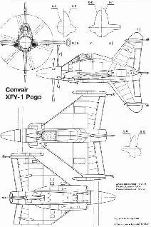 С самого начала «Конвэр» приняла решение создавать XFY-1 исключительно как СВВП, без какой-либо возможности обычного взлета. Основным фактором, определившим такое решение, была трудность в подборе другой схемы шасси, соответствующей единственной в своем роде аэродинамической схеме «Пого» - крестообразной комбинации дельтавидного крыла и больших вертикального и подфюзеляжного килей. К испытаниям двигателя YT-40 на вертикальном испытательном стенде в Линдберг Филд (Калифорния) «Конвэр» приступила в феврале 1954 г. Стенд состоял из закрепленного на четырех стойках двигателя с винтами и передней части фюзеляжа, включавшей кабину. В ходе испытаний YT-40 работал практически безотказно и в марте был установлен на самолет. Последовавшая затем серия испытательных полетов на привязи была официально названа вертикальными рулежными испытаниями. Они проходили на базе ВМС Моффет Филд (Калифорния) в старом ангаре для дирижабля высотой 195 футов (60 м). 29 апреля 1954 г. летчик-испытатель подполковник Джеймс Ф. Колеман совершил первый подъем на «Пого». За ним последовали сотни взлетов и посадок на привязи, а 1 августа 1954 г. состоялся первый свободный вертикальный полет вне ангара, в котором Колеман достиг высоты 20 футов. В следующей попытке «Пого» поднялся на 150 футов. Для проведения полномасштабных летных испытаний, включавших переход к горизонтальному полету, самолет был перевезен на вспомогательную базу ВМС Браун Филд. Там, начиная с сентября, Колеман произвел около 70 коротких пробных подлетов для подготовки к переходу в горизонтальный полет, возвращению в вертикальное положение и посадке. 2 ноября состоялся 28-минутный полет, в котором 21 минуту самолет находился в горизонтальном положении. Спустя два дня, 4 ноября 1954 г., корреспонденты и военные были приглашены для публичного показа первого в своем роде ЛА. Демонстрация «Пого» в воздухе была проведена 8 прекрасной зрелищной манере, характерной для всех показательных полетов Колемана. После вертикального взлета он плавно перевел машину в горизонтальный полет на высоте не более 50 футов. Закончив облет авиабазы, летчик перевел самолет в вертикальное положение и мягко, как балерина, приземлился. Сотрудники «Конвэра» и приглашенные гости были поражены как мощным XFY-1, так и летным мастерством Колемана.