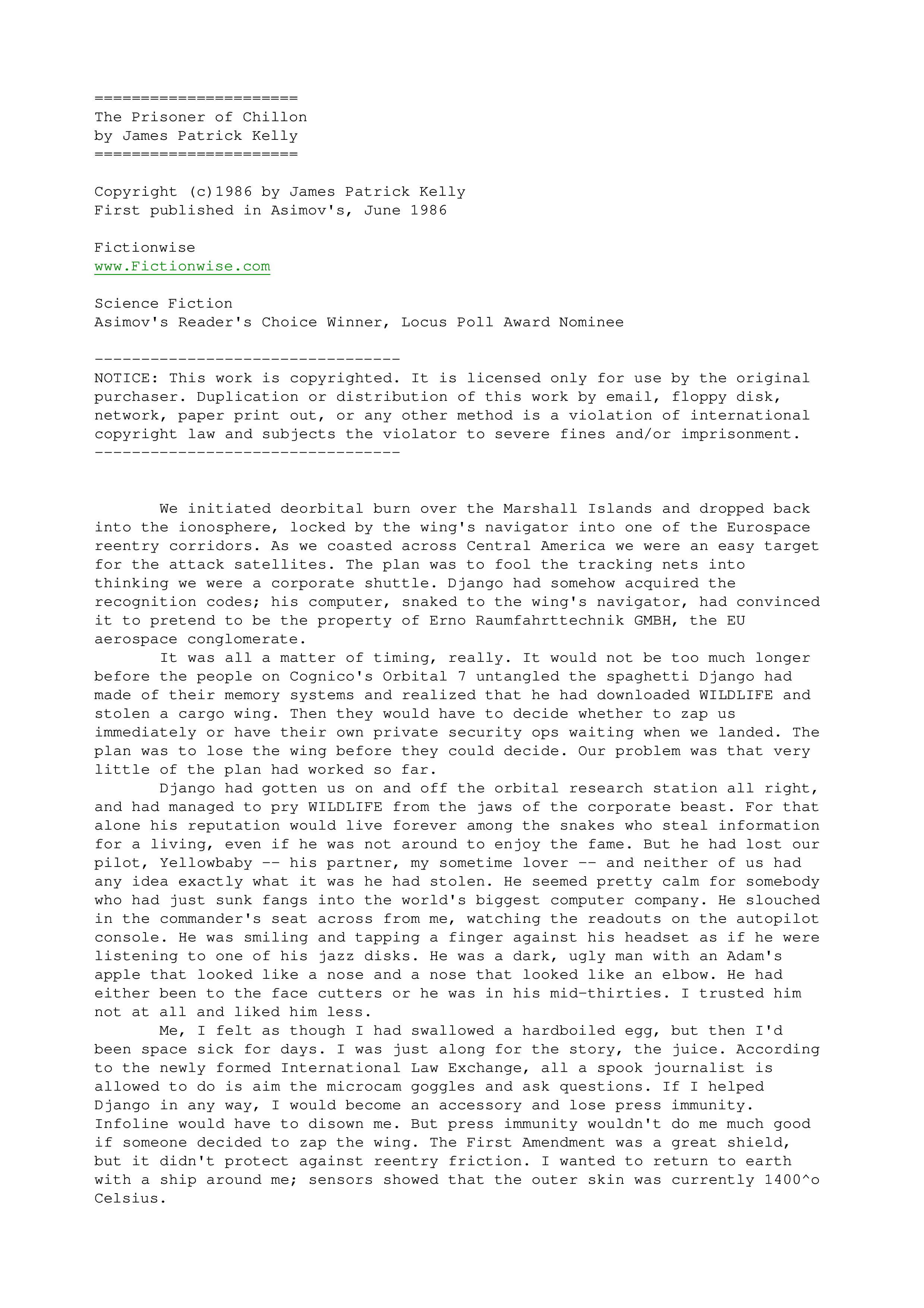 "James Patrick Kelly - The Prisoner of Chillon" - читать интересную книгу автора (Kelly James Patrick)