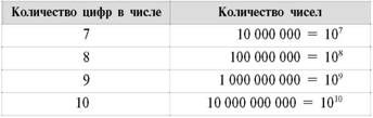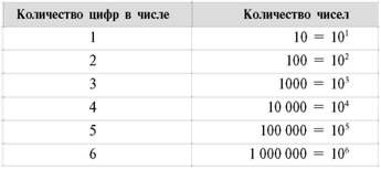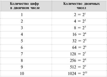 Теперь, имея такую чудную таблицу, займемся важным делом: подсчитаем, сколько же разных слов можно составить из наших цифровых «букв». То есть снова посчитаем количество чисел с одинаковым количеством цифр, но уже в двоичной системе счисления. Только не запутайтесь: подсчет будем вести в десятичной системе. Итак, изучая эту таблицу, получаем: ■ 2 однозначных двоичных числа 0 и 1; ■ 4 = 22 двузначных двоичных числа: 00, 01, 102 и 112; ■ 8 = 23 трехзначных двоичных чисел от 000 до 1112; ■ 16 = 24 четырехзначных двоичных чисел от 0000 до 11112. Уф! Дело сделано. Позволим себе рассуждать по аналогии и, учитывая подобный опыт подсчета количества таких чисел для десятичной системы, получим уникальную таблицу количества всех двоичных чисел, имеющих один знак, два знака, три знака и так далее до десяти знаков.