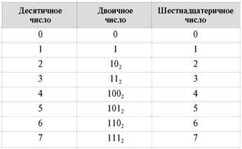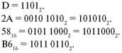 Гораздо интереснее переводить двоичные числа в шестнадцатеричные и обратно. Алгоритм перевода из шестнадцатеричной системы в двоичную такой: ■ каждая цифра шестнадцатеричной записи числа записывается четырехзначным двоичным числом; ■ нули, стоящие слева, можно отбросить. Запись шестнадцатеричных цифр двоичными числами берут из следующей таблицы, в которой везде, где это не может привести к недоразумению, у чисел опущены индексы с основанием системы счисления.