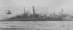 «Си Кинг» выполняет облет поврежденного аргентинцами фрегата «Ардент» Sea King makes an observation sortie around the crippled frigate HMS Ardent |