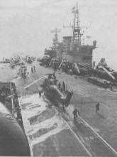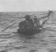 Круглосуточные полеты неизбежно вели к отказам техники. Этот «Си Кинг» совершил вынужденную посадку на воду и был потерян. Экипаж спасли Round the clock flying inevitably brought failure. This Sea King ditched and eventually sank after the crew had been rescued В отличие от летчиков технический состав эскадрильи не был перегружен работой. Ввиду отсутствия необходимого оборудования плановые ремонты и другие сложные формы обслуживания не проводились. Вертолеты летали пока летали. Роль техников практически сводилась к наполнению топливных баков, да замене время от времени той или иной вышедшей из строя детали. Можно сказать, что благодаря высокой надежности конструкции и всех систем «Си Кинга», техники работали даже меньше, чем в мирное время. Не было такого вида поддержки, на которую способны невооруженные вертолеты и которая не оказавалась бы 825-й АЭ наземным силам, продвигавшимся к столице Фолклендов – г. Порт-Стенли. Вертолетами перебрасывались пехотинцы и артиллерия, продукты питания и боеприпасы, перевозились грузы и люди с кораблей на берег и обратно, осуществлялись разведывательные полеты и полеты с представителями средств массовой информации на борту. К примеру, для переброски с кораблей на берег только одной батареи 105-мм гаубиц морской пехоты (6 орудий и 60 т боеприпасов, не считая расчетов и всего остального) требовалось не менее 40 вылетов «Си Кингов». Тогда как норма загрузки позволяет «Си Кингу» брать на борт 16 солдат в полном снаряжении, в ходе боев им приходилось перевозить иногда по 20 военнослужащих SAS с огромным количеством спецснаряжения, при этом десантники буквально висели гроздьями в дверях кабины. Несколько вертолетов получили пробоины от пуль и осколков, высаживая солдат непосредственно на поле боя под огнем противника. Так продолжалось до самой отправки в метрополию 15 июля, где эскадрилья была расформирована на авиабазе Калдроуз 16 сентября 1982 г. Но наибольшую славу 825-я АЭ снискала в спасательной роли. 8 июня в бухте Фицрой к юго-западу от Порт-Стенли британцы высаживали вспомогательный морской десант с танкоде-сантных кораблей «Сэр Тристрам» (RFA Sir Tristram) и «Сэр Гала-хад» (RFA Sir Galahad). Тут появились аргентинские «Скайхоки», и оба корабля, не успев высадить на берег 5-й пехотный батальон уэльских гвардейцев (The Welsh Guards) и полевой госпиталь, получили бомбовые попадания. В этот момент возле поселка Фицрой на земле находился вертолет командира 825-й АЭ Хью Кларка. Переждав налет штурмовиков, Кларк поднял свою машину в воздух. Оба корабля были уже охвачены пожаром в нескольких сотнях метров от берега, а густой дым снижал видимость практически до нуля. Но Кларк приступил к спасению людей. Вскоре прибыли еще два вертолета из 825-й АЭ, пилотируемые капитан-лейтенантами Филом Шелдоном (Phil Sheldon) и Джоном Боутоном (John Boughton). Им пришлось подлетать к терпящим бедствие в дыму, маневрируя в опасной близости от мачт и такелажа. Вертолеты снимали людей с маленьких непригодных для посадки участков носовой палубы. Внезапно на «Сэре Галахаде» начали взрываться боеприпасы, и уэльские гвардейцы были вынуждены прыгать с высокого борта в ледяную воду.