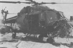 Вертолет «Линкс», поврежденный неразорвавшейся аргентинской авиабомбой прямо на палубе фрегата «Бродсуорд» The Lynx helicopter damaged by an Argentinian bomb right on the HMS Broadsword flihgt deck 826-я АЭ вертолетов «Си Кинг» под командованием капитана III ранга Дугласа Сквайера (Lt. Cdr. Douglas Squier) базировалась на авианосце «Гермес» и выполняла задачи, аналогичные 820-й АЭ. Серьезные испытания ее пилотам выпали в ночь с 14 на 15 мая, когда на о. Пеббл высаживалась РДГ. Порывы ветра, превышавшие временами 100 км/ч, вынудили корабли охранения отстать, и только «Си Кинги» 826-й АЭ осуществляли противолодочное охранение авианосца и визуальную разведку надводных целей, что и позволило, в конечном счете, успешно завершить операцию. За время боевых действий 826-я АЭ потеряла два вертолета. Согласно заявлению англичан, оба совершили вынужденные посадки на воду по причине «технических неисправностей, связанных с трудностями эксплуатации в неблагоприятных погодных условиях». Экипажи их были успешно спасены. 824-й АЭ командовал капитан III ранга Йен Маккензи (Lt. Cdr. Ian McCenzie). Экипажи его эскадрильи были поделены на звенья и размещены для противолодочной обороны на кораблях Королевского Вспомогательного Флота (Royal Fleet Auxiliaries), выполнявших перевозки войск и военных грузов. 3 июля одно из звеньев 824-й АЭ в составе трех «Си Кингов» было переброшено на берег залива Сан-Карлос для решения транспортных задач, чему пилоты-противолодочники практически не обучались. Вообще, решение неожиданных, выходящих за рамки обычных для того или иного рода авиации задач стало характерным для британских летчиков в ходе этого конфликта. Следует отметить, что с таковыми нештатными задачами они справлялись с честью. Упомянутое звено из 824-й АЭ в течение четырех суток доставляло с транспортных судов на берег предметы снабжения, боеприпасы и снаряжение. Характерным для этой войны стало участие новых подразделений, которые быстро создавались для участия в конфликте и расформировывались практически сразу по его окончании. Так, например, были сформированы упомянутая выше 848-я АЭ вертолетов «Уэссекс» HAR.5, 847-я и 825-я АЭ вертолетов «Си Кинг», в полном составе принявшие участие в боевых действиях. 825-я транспортная эскадрилья была создана в ответ на острую потребность английских войск в большом количестве транспортных вертолетов, каковым вполне могла считаться базовая модель «Си Кинга», поднимающая на внешней подвеске до трех тонн груза. Формировать подразделение поручили капитану III ранга Хьюго Кларку (Lt. Cdr. Hugh Clark), который командовал 706-й учебной вертолетной АЭ повышенной летной и тактической подготовки. Командование предоставило ему настоящий карт-бланш: все необходимое для укомплектования эскадрильи из 10 вертолетов – людей, оборудование, снаряжение он получал по первому требованию. Кларк приступил к делу 3 мая, а уже 7 мая формирование 825-й АЭ было завершено. За эти 4 дня со всех «Си Кингов» эскадрильи демонтировали опускаемые гидроакустические станции, установили дополнительные радиостанции для работы в сетях связи сухопутных войск и для снижения заметности закрасили черной краской условные обозначения белого цвета на фюзеляжах. Весь личный состав получил незнакомое камуфлированное обмундирование и арктическое снаряжение. Каждому пилоту выдали по пистолету, а оператору – по пистолету-пулемету «Стерлинг» L2A3. Че