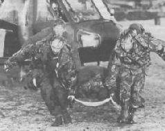 Вертолеты «Скаут» и «Газель» морской пехоты использовались для эвакуации раненых с поля боя. На снимке: во время вывоза пострадавших при бомбежке в бухте Фицрой The Royal Marines helicopters, both Scouts and Gazelles, were used for casualty evacuation from the battlefield, A Fitzroy casualty is pictured here