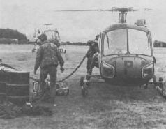 Прямо из бочки – основной способ заправки вертолетов «Скаут» АН.1 морской пехоты на передовом пункте базирования в бухте Тил Инлет Straight from the can! Basic Scout AH.1 helicopter refuelling at the Commando Air Squadron forward operating base at Teal Inlet 28 мая в 11.00 (время местное) вертолет «Скаут» АН.1 лейтенанта Ричарда Нанна (Lt. Richard Nunn), бортовое обозначение XT 629, направлялся на передний край для эвакуации раненых, когда его внезапно атаковала пара аргентинских штурмовиков IA-58A Pucara из 3-й авиагруппы (Grupo 3 de Ataque). Самолеты открыли огонь из бортовых пушек и произвели пуск НАР. От первого залпа Нанну удалось уклониться энергичным маневром, однако штурмовики быстро развернулись, и на втором заходе «Скаут» был поражен. Английский летчик погиб, а его наблюдатель получил ранения. Сбил их лейтенант ВВС Аргентины Хименес (Lt. Gimenez) на «Пукаре» с бортовым № 537. Его ведомым был лейтенант Симбаро (Lt. Cim-baro). Из этого боевого вылета Хименес не вернулся, его тело и обломки самолета были обнаружены только в 1986 г. высоко в горном хребте Блу Маунтинз, в 19 км от поселка Гуз Грин. Вероятными причинами катастрофы стали плохая погода и малая видимость. Потери не сломили боевой дух вертолетчиков морской пехоты. 26 мая началось наступление 2-го парашютного батальона на поселки Дарвин и Гуз Грин, для непосредственной авиационной поддержки которого были выделены 2 «Газели» и 2 «Скаута». В течение 3 дней эти вертолеты постоянно находились в воздухе, доставляя боеприпасы и вывозя раненых. 12 июня эскадрилья 3-й бригады поддерживала 42-й и 45-й батальоны морской пехоты и 3-й парашютный батальон в тяжелых боях за высоты Маунт Харриет, Ту Си-стерс и Маунт Лонгдон. За 24 часа ее экипажи эвакуировали с поля боя 85 человек. Капитан Ньюкомб (Capt. Newcombe) с наблюдателем капралом Рафтоном (Cpl. Roughton) не только вывозили раненых, но и осуществляли проводку вертолетов «Уэссекс», доставлявших снаряды артиллеристам. Капитаны Макейг-Джонс и Па-ундс (Capt. Pounds) ночью, в пургу, не менее 5 часов вели свои «Газели» над сильно пересеченной местностью на высоте 15 метров, чтобы спасти жизнь 3 тяжелораненым в районе Порт-Стенли военнослужащим SAS. Летчики пользовались при этом очками ночного видения. А на рассвете 14 июня, в момент наивысшего напряжения боев за Порт-Стенли, два «Скаута» АН.1 из состава эскадрильи уничтожили своими ПТУР SS-11 три полевых орудия аргентинцев. В тот же день гарнизон города капитулировал.