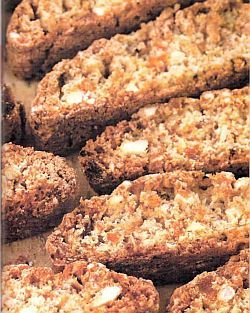 "Таинственные бискотти — дважды запеченное печенье" - читать интересную книгу автора (Селезнев Александр)Бискотти с орехами и сухофруктамиПросеянную муку смешать с сахаром и разрыхлителем. Постепенно ввести в муку слегка взбитые яйца. Вымесить эластичное упругое тесто, добавить мелко нарезанные курагу, финики, орехи и цедру. Из теста сформовать два одинаковых, слегка приплюснутых батона длиной примерно 20 см. Переложить на смазанные маслом противни и выпекать в духовке при температуре 180 °C 20–25 минут. Остудить, не снимая с противня. Остывшие батоны нарезать по диагонали примерно на 10 кусочков толщиной 1 см. Переложить ломтики на противни и снова поместить в духовку на 10–15 минут, перевернув один раз во время выпекания. Готовые бискотти оставить остывать на противнях.