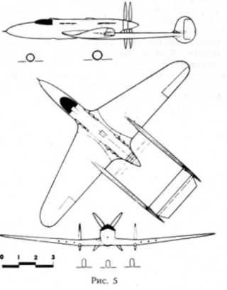 Однако еще до окончания исследований и получения результатов появляются проекты самолетов, в которых реально могла воплотиться исследуемая идея, Даже далекое от «сухопутных» проблем конструкторское бюро Бсриева, специализирующееся на машинах для гидроавиации, разрабатывает в 1 940 г. проект такого самолета, получившего обозначение Б-1 0 (рис, 5). 1 5 февраля 1940 г. Берисв обращается в Наркомат авиационной промышленности к заместителю наркома А. С. Яковлеву с просьбой рассмотреть его предложение и включить в план работ авиапромышленности на 1940- 1941 гг. Эскизный проект Б-10 представлял собой перехватчик или пикирующий бомбардировщик, выполненный по двухфюзе-ляжной схеме. Самолет предполагалось оснастить двумя двигателями М-107 с приводом на соосные толкающие винты. Подобная схема с использованием ламинарного профиля крыла NACA 23012 давала расчетную скорость 8 1 8 км/ч. Проект имел следующие основные данные: Размах, м…1 3,0 Длина, м …1 1,260 Плошадь крыла, м…26,0 Полетный вес, кг…ЗЯ70 Практический потолок, м… 10000 Дальность, км…1 000 (0,9 Nm , ix |. В заключении ГУАС КА (Главное Управление Снабжения Красной Армии) по проекту Б-10 говорилось, что проект вполне реален и может быть реализован. Однако, так как Берисв уже имел задание на катапультируемый корабельный разведчик КОР-2, было признана целесообразным передать разработку проекта Болховнт.пюву, который к тому времени уже имел опыт работы в этой области и реально летающий самолет «С». В КБ Болховитинова эта машина получила обозначение «И». Разработка велась до весны 194 1 г. Пришлось преодолеть большое количество трудностей конструктивного и технологического характера. Однако неожиданное препятствие остановило разработку машины. 25 апреля 1 94 1 г. Болховитипон был вызван на совещание к заместителю наркома авиапромышленности Баландину. Присутствующие на совещании директор моторного завода Лаврентьев и главный конструктор двигателей Климов сообщили о невозможности создания снарки двигателей М-107П. Основной причиной отказа было чрезмерное форсирование М-107П; считалось, что на этом сверх напр я жен и ом двигателе при установке удлиненного вала на рабочих оборотах могут возникнуть опасные резонансные явления, которые приведут к разрушению конструкции, Кроме того, завод имел огромный план по выпуску двигателей, вел сложную работу по доводке двигателей М-105, М-107, М-1 20. Загнанному в угол Болховитинову было предложено выбрать любой другой тип двигателя из имеющихся в стране и переработать под него свой проект. После размышлений конструктор выбрал дизель М-4 0, который хотя и был тяжеловат, но расходовал в два раза меньше топлива. Смена двигателя повлекла за собой и изменение всего проекта. Предварительные изыскания, проведенные в мае – июне 1941 г., вернули конструктора к схеме «С». Кроме того, заинтересовавшись характеристиками М-4 0, Болховитинов разрабатывает проект четырехмоторного бомбардировщика с тандемной установкой двигателей. Однако начавшаяся война не позволила продолжить эти работы. Примерно в середине 1941 г. были закончены исследования соосных воздушных винтов в ЦАРИ, позволившие сделать следующие выводы. 1. КПД соосных винтов при больших относительных поступях (большая поступь винта, т. е. большой шаг соответствует высокой полетной скорости) на 2 – 4% выше, чем КПД одного из одиночных винтов комби