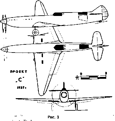 В 1936 г. заведующий кафедрой самолетостроения Военно-воздушной академии им. Н. Е. Жуковского Виктор Болховитинов, удовлетворенный достигнутым успехом при создании четырехмоторного тяжелого бомбардировщика ДБ-А, обращается к проблеме создания скоростного боевого самолета. Из многих вариантов компоновок он выбирает схему с двумя двигателями М-103, установленными один за другим (тандемом) с передачей на соосные воздушные винты, Для решения этой задачи он конструирует спаренную установку двигателей с последующей отработкой на стенде. Стендовые испытания дели обнадеживающие результаты, поэтому в 1937 г. под руководством Болховитинова разрабатывается проект скоростного ближнего бомбардировщика, получившего индекс «С» (существовало несколько вариантов расшифровки индекса: «Сталин», «Спарка», «Спартак»). Первоначально это был самолет с однокилевым оперением и с различными вариантами применения и вооружения. На представленных схемах изображены именно первые прорисовки самолета «С» (рис. 3).