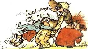 Голос Моховой Бороды сразу стал суровым. – Ты наступил на гадюку! – сказал он с упрёком и небрежным движением вытолкнул Полботинка из-под своей бороды. – Да куда же твои глаза смотрели, курица ты слепая! И Моховая Борода устремился туда, где трава колыхалась. Через мгновение он уже склонился над гадюкой и с нежностью говорил: – Маленькая ты моя! Конечно, грубый Полботинка наступил на тебя, потому ты так и дрожишь. Полботинка топтал тебя своими ужасными голыми пальцами! Он же глупый, но ведь он не нарочно. Давай простим Полботинка, ладно? Муфта украдкой подобрался к Полботинку и шёпотом спросил: – Она тебя не укусила? – Нет, – прошептал Полботинка. – Но чуть было не укусила. В последний момент я успел подпрыгнуть. – Твоё счастье, – сказал Муфта с облегчением, но тут же по его лицу пробежала тень ужаса. – Смотри, что делает Моховая Борода! – Ох, беда! – воскликнул Полботинка. – Берегись, Моховая Борода! – крикнул Муфта. Моховая Борода поднял гадюку и стал на неё дуть. Не обращая никакого внимания на тревогу друзей, он тихо бормотал: – Боль вороне, хворь сороке, наша Матильда скоро поправится. – Почему ты называешь её Матильдой? – спросил Муфта, успевший прийти в себя. – А что, разве она не похожа на Матильду? – улыбнулся Моховая Борода. – По-моему, Матильда как Матильда, у неё красивое имя. С этими словами он спокойно сунул гадюку в карман. – Послушай, – побледнел Полботинка, – надеюсь, ты не собираешься взять её с собой? – А почему бы и нет? – нахмурился Моховая Борода. – Разве не может она неделю-другую пожить в моём кармане? – Неделю-другую?.. – поперхнулся Муфта. – Да, да, – решительно заявил Моховая Борода. – Недели две, пока не поправится окончательно. Муфта и Полботинка поняли, что переубедить Моховую Бороду невозможно, и тяжело вздохнули. – Поскорей бы выпить успокаивающего отвара, – пробурчал Полботинка. Он направился к кустику валерианы и вырвал его. И они двинулись в обратный путь. Впереди Моховая Борода, за ним, шагах в двадцати, Муфта и Полботинка. |