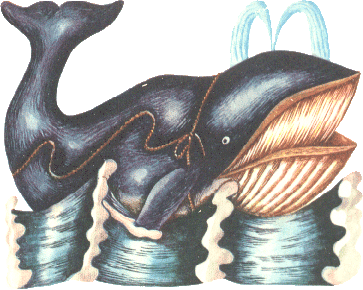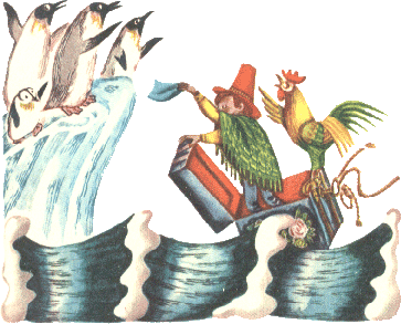 Но, по правде говоря, нас это касалось не очень, и лишних вопросов киту мы задавать не стали, а немедленно принялись готовиться к новому путешествию. Размотав клубок шпагата, я сделал упряжь, похожую на громадную узду с поводьями. Узду я накинул на кита, а поводья привязал к сундуку. Кит из дырки во лбу выпустил фонтан, шевельнул хвостом, поводья натянулись — и мы отчалили от холодных, но гостеприимных берегов Антарктиды. Пингвины провожали нас до самых дальних айсбергов, а затем мы втроём вышли в пустынный, открытый океан. |