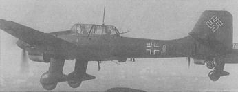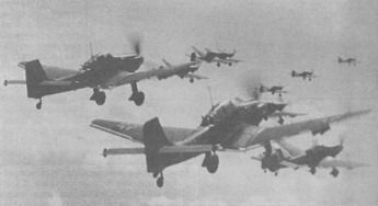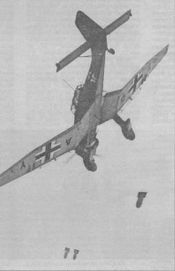 Ju 87B-1 из состава 2/St.Gl возвращается после боевого вылета над Польшей В ходе налетов на крепость Модлин и мосты через Вислу в этом районе "штуки" впервые столкнулись с сильным и хорошо организованным зенитным огнем. В дальнейшем всю вторую мировую войну им пришлось постоянно воевать именно в таких "стандартных" условиях. Наибольший успех на долю Ju-87 пришелся в сражении в районе г.Кутно на реке Бзура (100 км западнее Варшавы). В течение 9-10 сентября здесь между флангами наступающих 8-й и 10-й немецких армий образовался разрыв. Встык по оголенным флангам ударили 12 польских дивизий, пытаясь таким образом приостановить продвижение немцев к Варшаве. Это контрнаступление едва не изменило ход войны. Здесь крупных резервов у вермахта не было, и в итоге немцы приняли решение для отражения контрудара использовать всю мощь авиации. В течение двух дней массированными атаками с воздуха, в которых участвовали Ju-87 из StG77, StG2, III./StG51 и I./StG76 (около 150 "штук"), Ju-88 и Hs-123, сначала были разрушены мосты через Бзуру, а затем попавшие "в котел" 10 польских дивизий были деморализованы и окончательно разгромлены. Контрнаступление поляков сорвалось, 18-19 сентября были окружены и сдались около 170000 человек. В качестве меры устрашения массированным ударам подверглась столица Польши Варшава. Под Прагой (предместье Варшавы) "штуки" уничтожили батареи тяжелой артиллерии, сдерживавшие продвижение захватчиков. Кинотеатры всего мира демонстрировали немецкую хронику, показывавшую, как 8 сентября 140 Ju-87 из III/StG51 и StG77 бомбили беззащитный город, превращая его в развалины. "Юнкерсы" совершали по три и более боевых вылетов в день, сбросив на город более 500 тонн бомб и 72 тонны зажигательных средств. Налеты на Варшаву и Модлин продолжались и в последующие дни. 26 сентября крепость Модлин капитулировала, в тот же день во время налета I/StG2 на Модлин потеряли последний Ju-87, всего их сбили 28 (по другим данным 34 - 31), из них 11 уничтожили истребители. За 27 дней польской кампании суммарные потери люфтваффе составили 521 самолет, в процентном отношении потери "штук" (9%) были значительно меньше по сравнению с другими типами самолетов (14-30%). В целом командование люфтваффе осталось довольным действиями Ju-87 в небе Польши. "Штуки" - "воздушная артиллерия" - наносили удары очень точно (как правило, все бомбы укладывались в 30-м круг) и проявили себя весьма грозным и очень эффективным оружием. Дополнительным и особенно эффективным психологическим воздействием было применение сирен против мирных жителей - беженцев, и при атаках гражданских обьектов. В ходе польской кампании окончательно выработалась тактика действий пикировщиков. Первоначально летчики, чтобы избежать потерь от зениток, подходили к цели на высоте около 6 км. Но в ходе боев выяснилась, что такая мера предосторожности излишняя, высоту снизили. Однако другие "меры безопасности" - по возможности атака со стороны солнца и против ветра, строго ограниченный радиообмен, соблюдались неукоснительно и в немалой степени способствовали успешному выполнению заданий. На пикировании с углами около 70° выпускали тормозные решетки, скорость уменьшалась на 200 км/ч (с 650 км/ч до 450 км/ч), позволяя более точно прицелиться. "Штукари" в зависимости от типа цели применяли, главным образом, два основных способа бомбометания: - пикирование с высот 2-5 км под углами 60-80°, сброс 