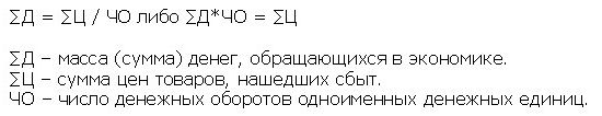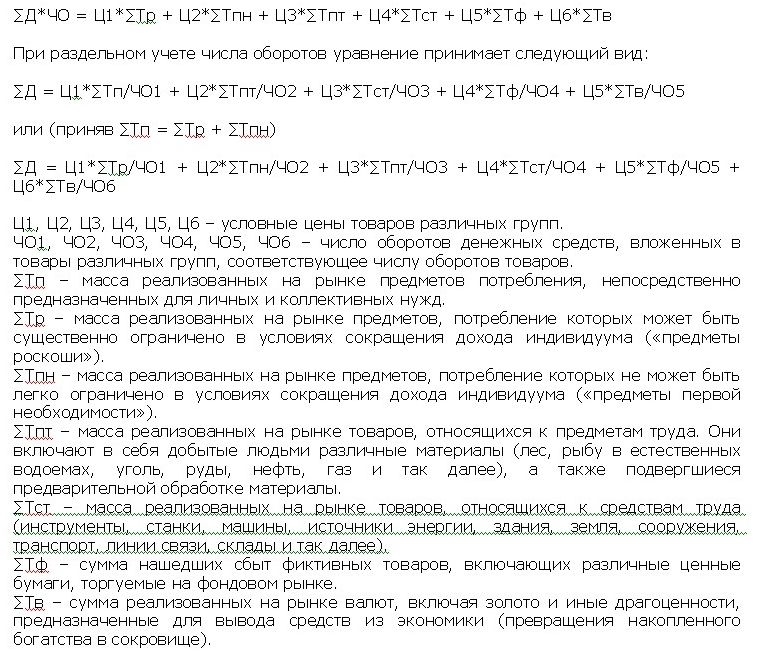 Изложенный всеобщий закон может быть описан еще более подробно. Для этого требуется разделить сумму цен товаров на основные группы, принимая каждую равной условной цене за единицу товара, помноженной на сумму проданных товаров. Отношения аренды подлежат учету в общем порядке, рассматриваемые как отношения приобретения временного права собственности на тот или иной товар. Услуги как не являющиеся согласно нормам классической экономики материальным продуктом труда отдельному учету в формуле не подлежат. Затраты на них включаются в цены производимых товаров, то есть оказание услуг оплачивается за счет материального производства. Услуги являются частью этого процесса, а не играют самостоятельной роли. Также важно уточнить, что в формуле должны учитываться лишь реализованные товары, без учета выставленных на продажу, но не нашедших покупателей - застрявших на рынке.