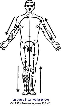 б) Снова начнем с Т. Мысленно собираем комочек Т в области копчика, стараемся представить его поярче как бы изнутри. Собираем этот комочек Т в течение примерно 6-10 секунд, представляя мысленно его как очень приятное, целебное, прогревающее самый низ позвоночника как бы изнутри, полностью. Затем, собрав этот комочек Т, начинаем его передвигать вверх по позвоночнику, не спеша, мысленно представляя те места, где Т проходит, — через поясничную область, выше, выше, мысленно как бы перебирая, просматривая по-хозяйски каждый позвоночек сантиметр за сантиметром, ничего не пропуская, чуть больше внимания уделяя тем местам, которые беспокоили или беспокоят теперь; как бы слегка массируя их, разминая — мысленно; по ширине стараемся ощутить Т до 12–15 сантиметров. Переходим на грудной отдел, затем на шею до основания черепа; на мгновение задерживаемся здесь, и в обратный путь таким же образом — не спеша, с любовью и заботой перебирая, мысленно просматривая все подряд, каждый позвоночек, особенно те места, что больше беспокоят. Доходим вновь до копчика. Это также — один проход. Сделайте таких проходов 10. Затем точно так же выполните это упражнение с П, затем с X. Затем, как при передвижении ощущений в ногах, это можно выполнить с Т + П, X + П. Также, пожалуйста, выполните по 10 таких проходов с П и X, как это описано для Т. Вы замечаете, что с каждым повтором упражнение получается лучше и лучше. Благодарим вас. в) Давайте также начнем с Т. Мысленно соберите комочек Т в правой ладони; представьте его поярче, как приятное, прогревающее как бы насквозь тепло. Собираем этот комочек Т в течение 6-10 секунд, при этом стараемся ощутить его поярче (не сильнее, а ярче, образнее). Затем мысленно начинаем его передвигать вверх по руке, стараясь внутренним взором получше представить все места, через которые вы тянете, перемещаете это Т: по предплечью, через локтевой сустав, на плечо, через плечевой сустав. Далее на уровне правого плеча мысленно перемещаем комочек Т с правого плечевого — сустава в левый, не думая, через какие органы это ощущение проходит, что у вас там расположено. Старайтесь не растерять ощущение тепла и мыслешюяе спускайтесь ниже Это го уровня, ни в коем случае не затрагивая область сердца (рис. 1); далее спускаемся через левый плечевой сустав на левое плечо, через локтевой сустав ниже на предплечье до левой ладони. При передвижении Т мысленно получше представляйте те места, которые проходите, сантиметр за сантиметром, подряд все, чуть больше внимания уделяя суставам (если они вас беспокоили или беспокоят) — 1–2 секунды задержитесь здесь, стараясь по-хозяйски проверить, слегка их как бы растормошить, расшевелить, попросить получше работать. Как только дошли до левой ладони, мысленно на мгновение остановились, мысленно ее прогрели получше, можно до кончиков пальцев, как бы промассировали слегка, и в обратный путь тем же образом до правой ладони. Это один проход, сделайте таких проходов 10. Затем точно так же выполните это упражнение с П, затем с X. Затем, как и при передвижении ощущений в ногах и в позвоночнике, это можно выполнить с Т + П и Х + П. Выполните по 10 проходов с П и X, как мы это описали для Т. Есть успехи? Если есть, проходим дальше, не останавливаемся. Если не получается — повторим заново. Еще раз просим не забыть, что все эти упражнения следует делать с радост
