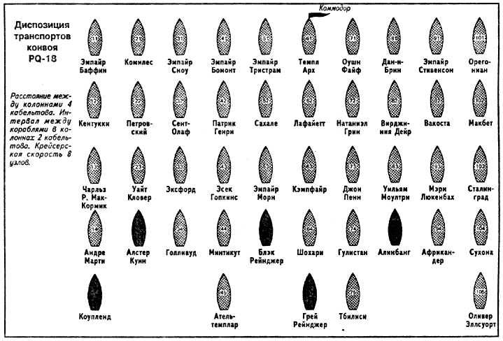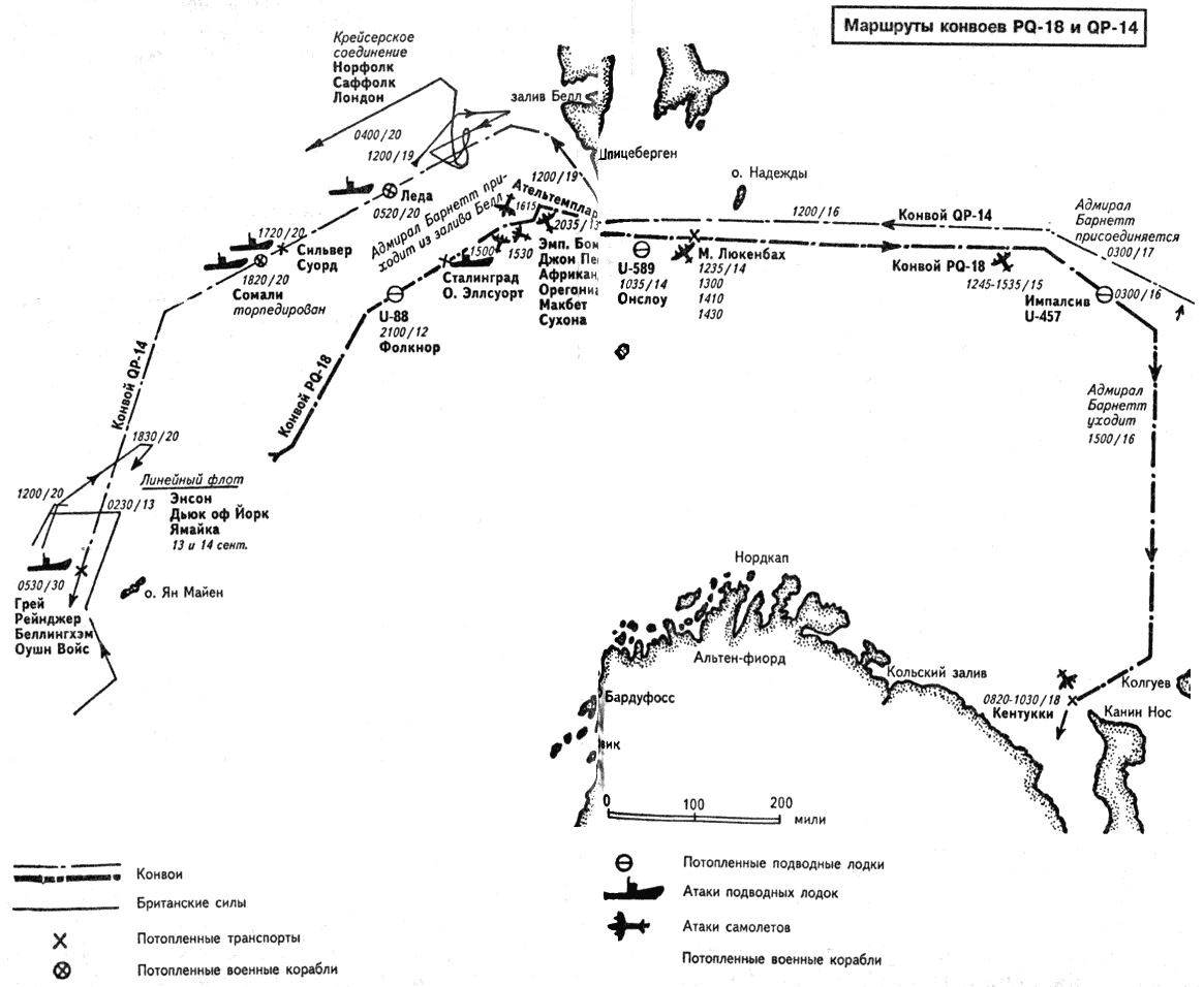 В 19.56 «Фарндейл» сообщил, что видит подводную лодку на поверхности. Было не очень ясно, где именно это произошло, но его примерная позиция в это время была в 60 милях по правой раковине конвоя. Радиограмма, полученная «Эскдейлом» около полуночи, указывала точку всего в 12 милях по левой раковине. В действительности «Фарндейл» в сумерках ненадолго заметил U-456 (капитан-лейтенант Тайхерт). Прозвучала боевая тревога, хотя экипаж и так находился на боевых постах. Носовая 102-мм установка должна была открыть огонь, но не сделала этого, так как наводчик не успел разглядеть цель. Подводная лодка погрузилась, когда расстояние до миноносца составило 500 ярдов. Были сброшены несколько глубинных бомб, но установить контакт с помощью асдика не удалось. Это совершенно не удивительно, учитывая погодные условия. Итак, подводная лодка пережила это столкновение, чтобы на следующий день снова вступить в бой. Однако не следует обвинять «Фарндейл». Корабль прибыл в Скапа всего 11 дней назад, поэтому не следовало ожидать, что его неопытная команда сможет оперативно действовать в стремительно меняющейся обстановке ночного боя. Чудесное спасение помогло U-456 сесть на хвост конвою. Следует отметить, что примерно в это же время германская авиаразведка обнаружила в Сейдис-фиорде «Аведжер» (принятый за «Аргус»), «Сциллу» (крейсер типа «Дидо») и Боевую эскортную группу эсминцев, поэтому немцы точно представляли, что происходит. Тем временем в 21.00 PQ-18 повернул на 30 градусов влево, но через 5 часов вернулся на прежний курс. Ночь прошла спокойно, а на рассвете 6 сентября «Джон Пенн» еще раз присоединился к конвою. Из-за потенциальной угрозы подводных лодок из Исландии были высланы еще 3 эсминца, чтобы усилить не слишком мощный эскорт. «Эхо», «Монтроз» и «Уолпол» прибыли в 13.00. Эти подкрепления позволили перестроить схему охранения. Так как на «Фарндейле» асдик вышел из строя после ночного происшествия, его место за кормой конвоя занял «Уолпол» (лейтенант А. С. Поумрой). «Кэмпбелл» и «Маккей» держались на траверзах конвоя, а «Эхо», «Франдейл», «Эскдейл» и «Монтроз» развернулись строем фронта впереди, держа интервалы 2500 ярдов. Конвой постепенно нагонял свой график, поэтому коммодор решил подождать утра 7 сентября, прежде чем перестроить растрепанный строй в две колонны для прохождения через пролив Рейкьянес. Это было сделано в 19.00, и когда пролив остался за кормой, «Оремар», «Сан-Зотика» и «Гейтуэй Сити», которые не должны были следовать далее, отправились в Рейкьявик в сопровождении траулера «Араб». Траулер принял на борт пассажира с «Эмпайр Тристрама», чтобы он мог вернуться обратно в Англию. Тем временем в 7.00 из Исландии вышла еще одна часть конвоя — 8 транспортов, в том числе русские суда «Андре Марти», «Комилес», «Петровский», «Тбилиси», «Сталинград» и «Сухона». Их сопровождали эсминцы «Малькольм», «Акейтес» и «Амазон», корабли ПВО «Алстер Куин» и «Алинбанк», тральщики «Харриер» и «Глинер «, корветы «Бриони», «Бергамот», «Блюбелл» и «Камелия», траулеры «Кейп Мариато», «Кейп Аргона», «Сент-Кенан» и «Данеман». Этой группой командовал капитан 2 ранга Э. Б. Рассел, командир сил непосредственного сопровождения конвоя. Траулеры вели на буксире 3 маленьких катерных тральщика MMS-90, MMS-203 и MMS-212. Считалось, что они не способны проделать столь долгий путь самостоятельно. Однако ка
